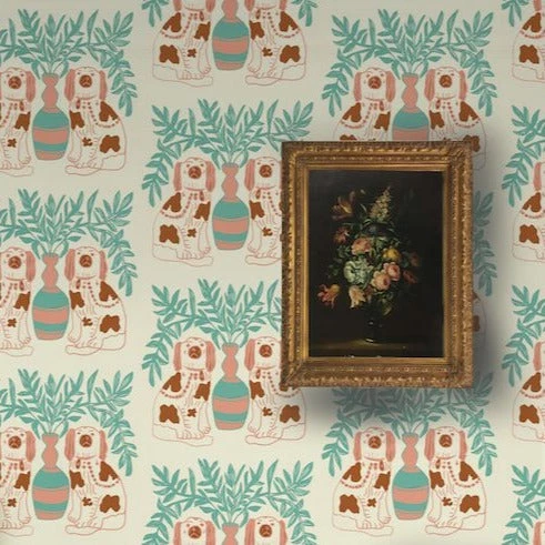 Wallpaper is a fantastic way to inject a sense of fun into your home. I have always loved the Staffordshire dog figurines, since first noticing the sweet pair sitting atop my Nan’s fireplace when I was a child.Â