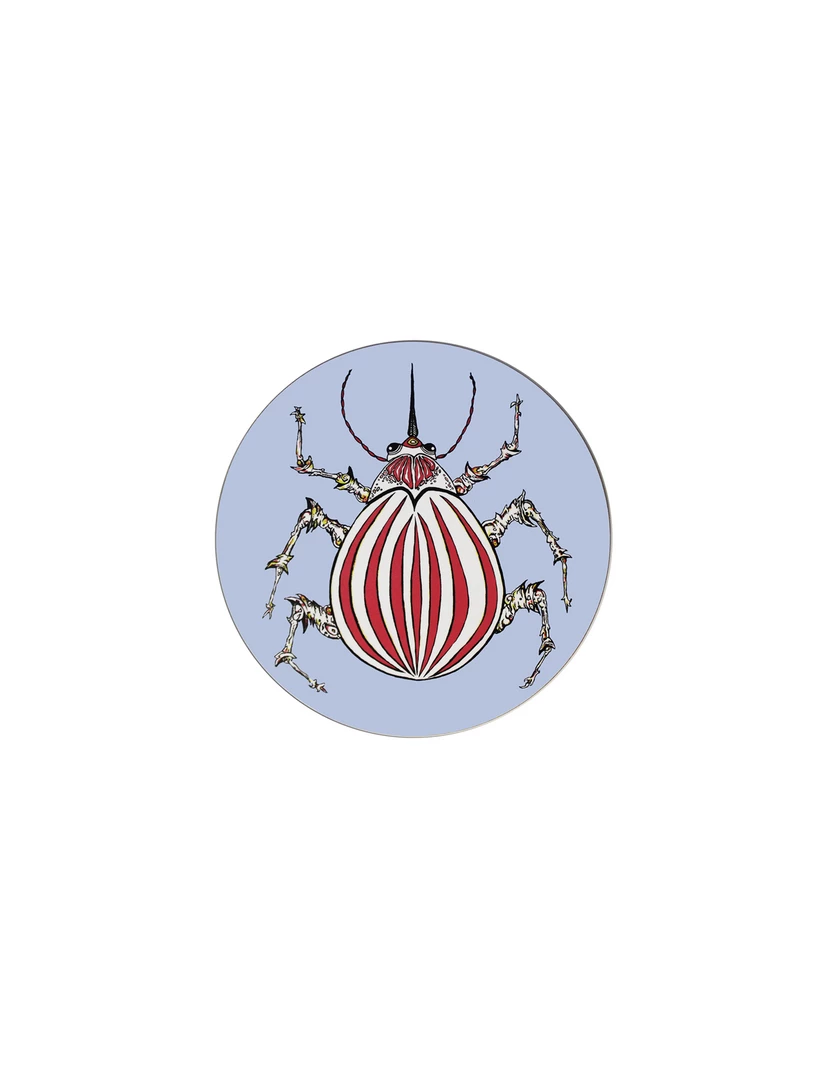 Beautifully illustrated melamine topped cork coasters. A round base with a periwinkle blue background colour, black, red & white beetle artwork. Sold as a set of six with matching placemats available for a dramatic and unique table scape.