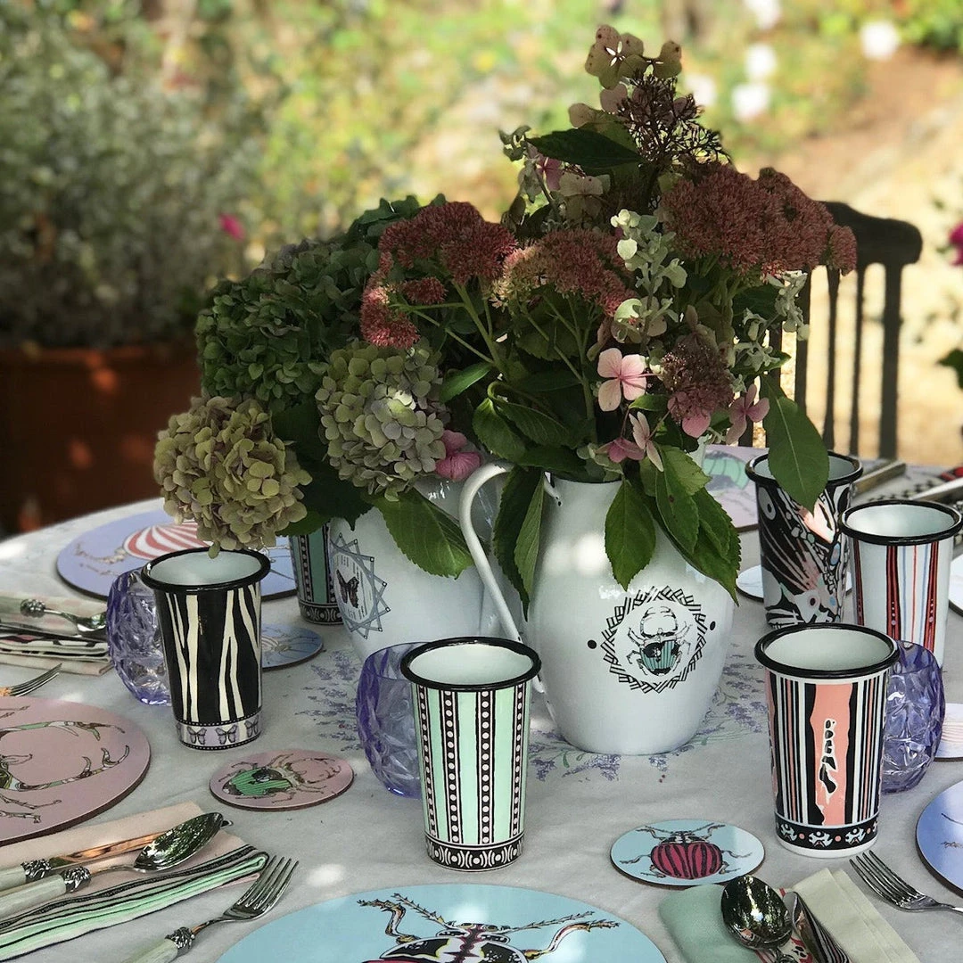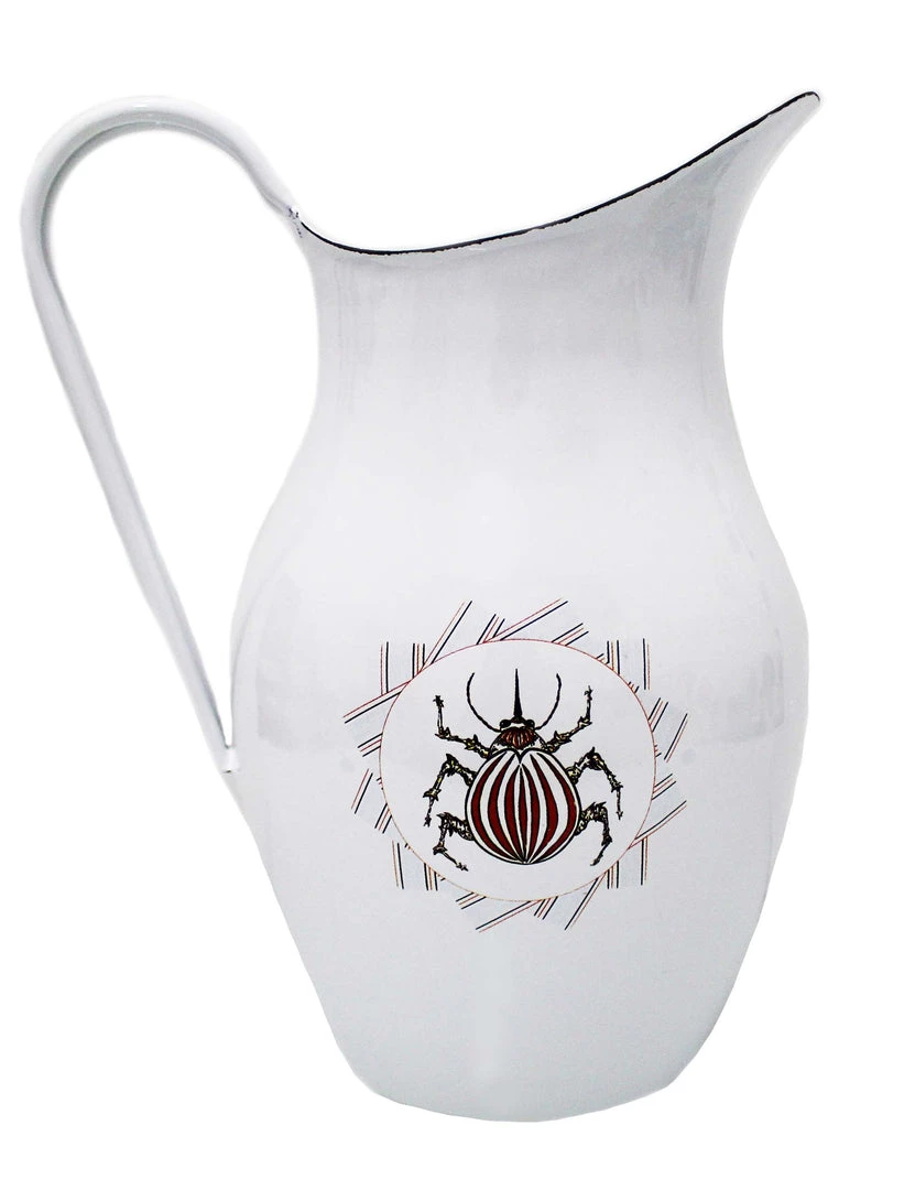 A four pint capacity jug to be used for water or a vase. White enamelware with a detailed painting of a beetle. An everyday item becomes an heirloom. Â