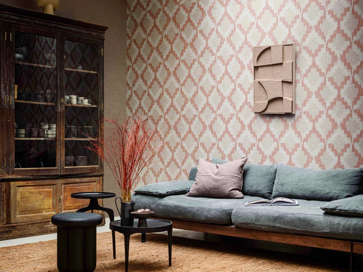 An large scale Ikat inspired weave print in earthy grass colour combinations. A matt surface with a textile feel. A great addition to a Bohemian, Farmhouse or Urban look interior.Â
