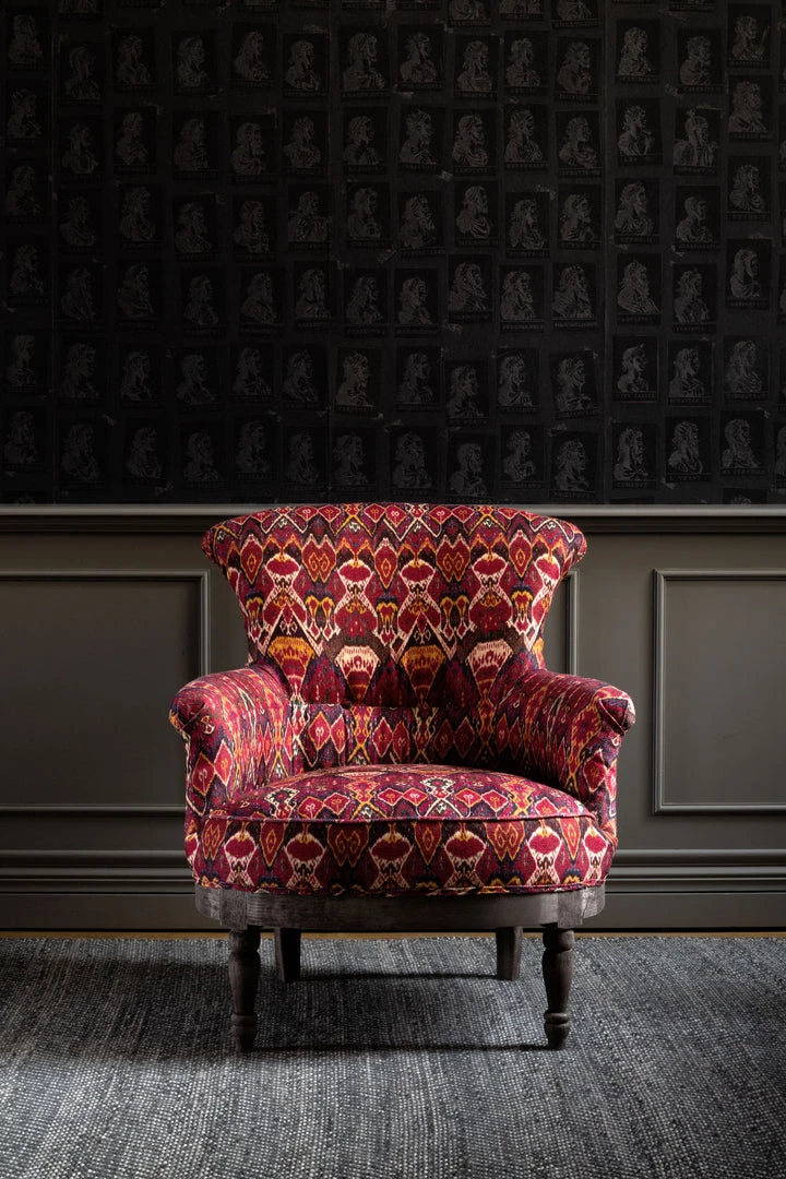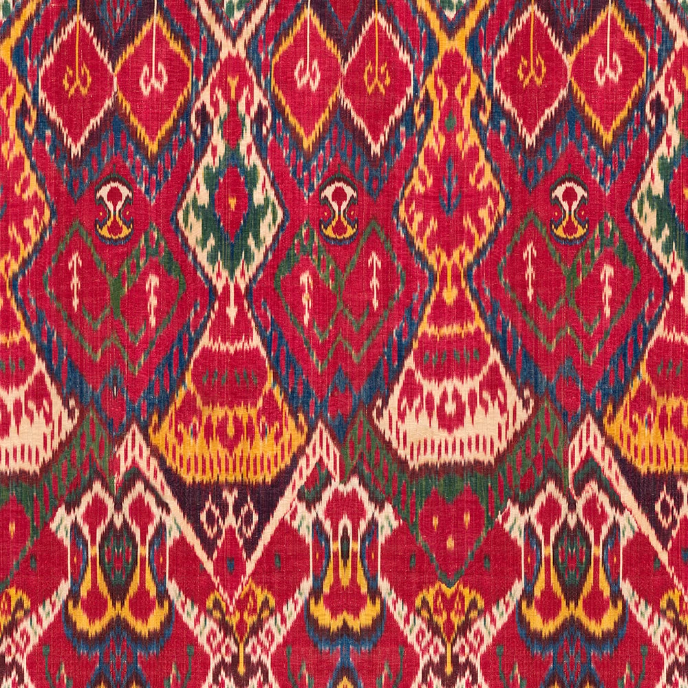A beautiful multicolour design inspired by traditional handwoven Uzbekistan Ikat silks. These bold kaleidoscopic patterns have been adopted into the modern Farmhouse look adding a depth and weaving into our cultural psyche. Printed on a robust heavy weave linen.