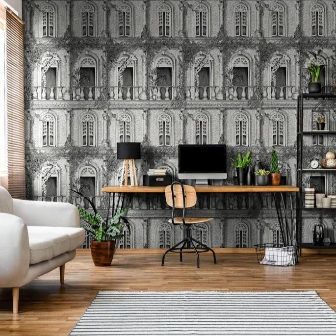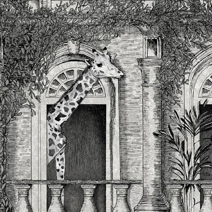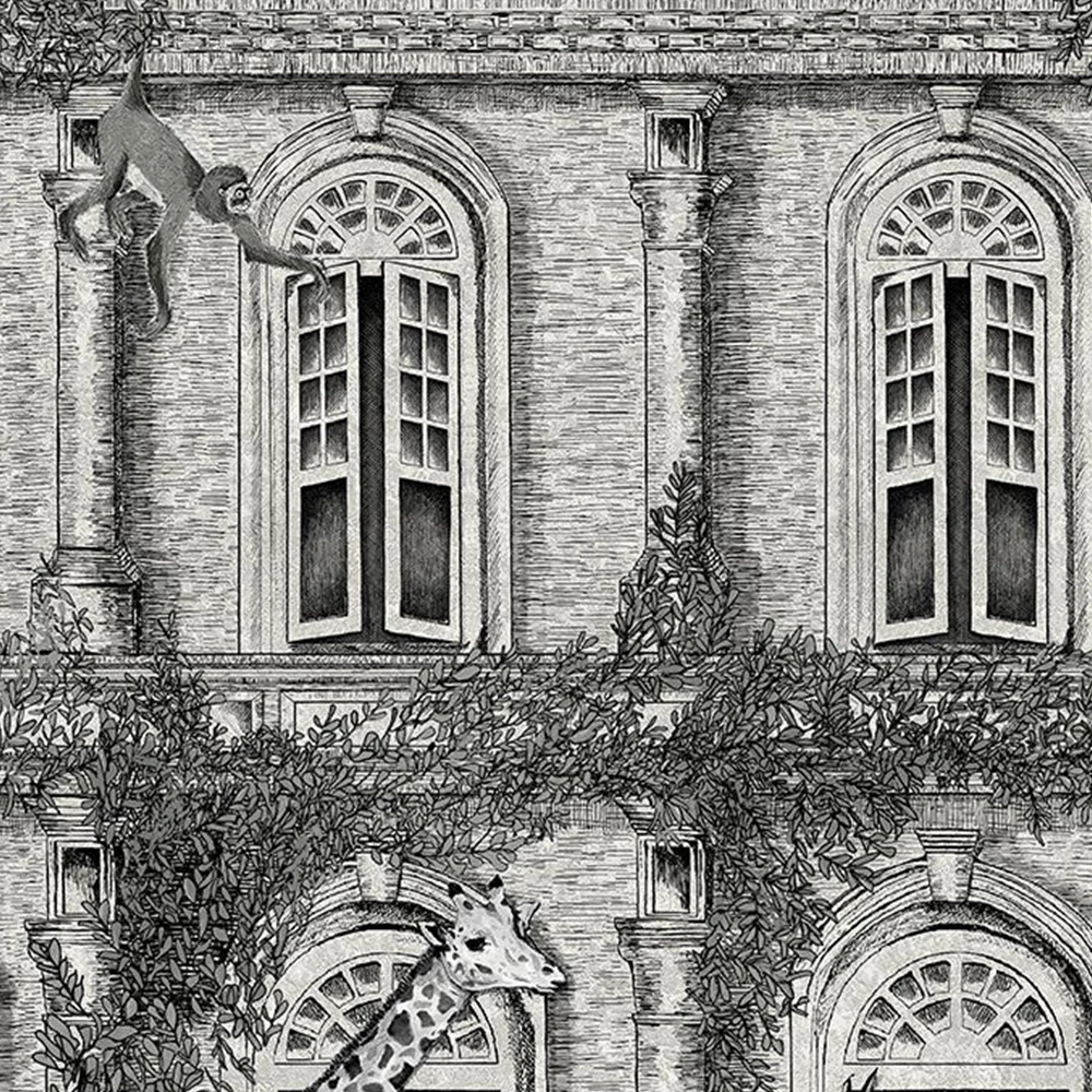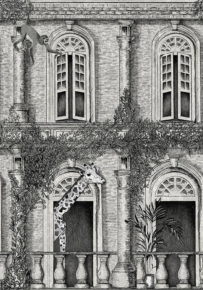 Inspired by the Giraffe manor in Kenya where breakfast can be shared with these gentle giants, Animal Architecture by Brand McKenzie is an extraordinary hand sketched design with amazing architectural detail on the building where mischievous monkeys and Giraffes catch a view to the world.