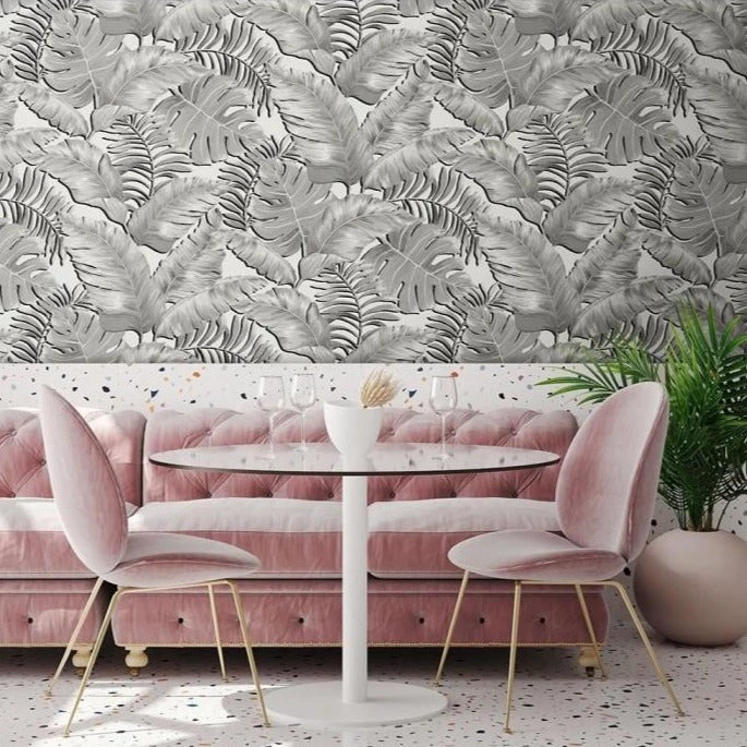 Banana leaves max is a bold scale wallpaper. It is an inspiring hand drawn piece of art with a variety of leaves that are large, wide, elongated, and slightly rounded. The surface of the leaves is easy on the eye as they appear waxy, flexible, and glossy. Although the colours are generally lime, olive green to dark green, here Brand McKenzie have designed alternative colours that sit comfortably within many home environments. Available in Black &White, Leaf Green, Blush Pink