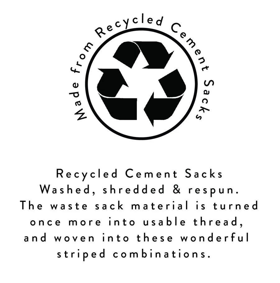 Empty cement sacks from the construction industry are collected, washed and shredded. The shredded material is spun into thread, re-dyed & woven into these wonderful bags.