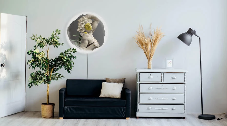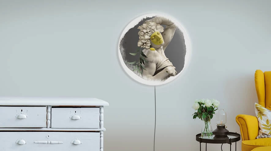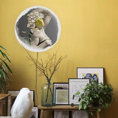 Indoor use only The paint is printed on a fabric allowing a uniform diffusion of light, while the disc on which it is applied is made of Dibond, a stable and rigid aluminum. |