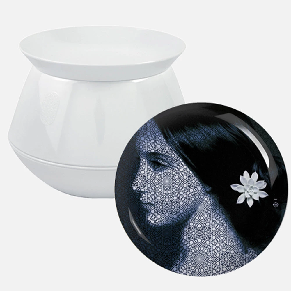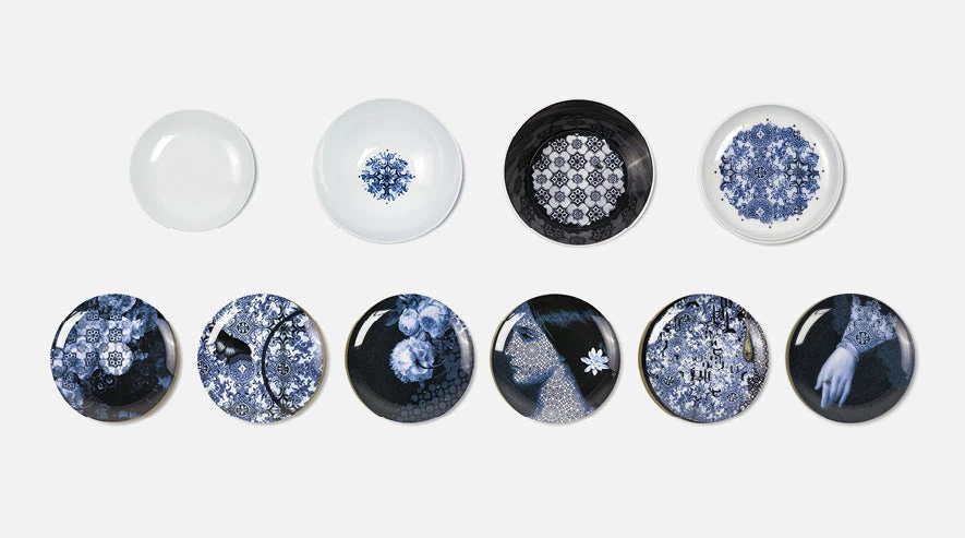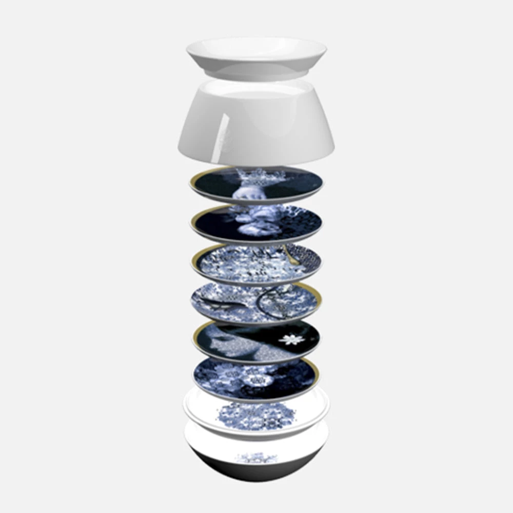 An object of stacking salad bowls and small plates to be used every day to enhance the appeal of the every dessert and conceals an illustrated story that can be seen immediately as the object is separated. The image is of a young woman, whose memories cunningly blend in with the ornamental and plant surrounding, languishes in the impressiveness of the Portuguese palace of Bussaco.Â