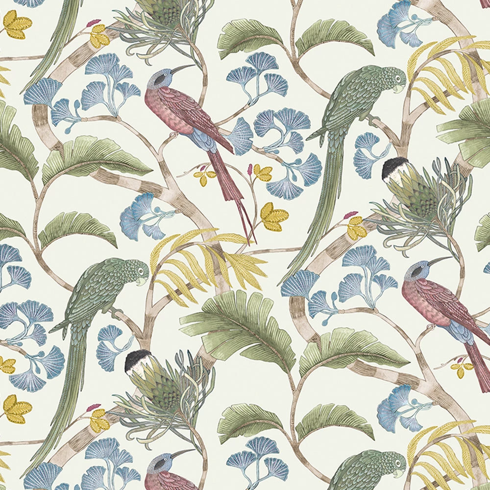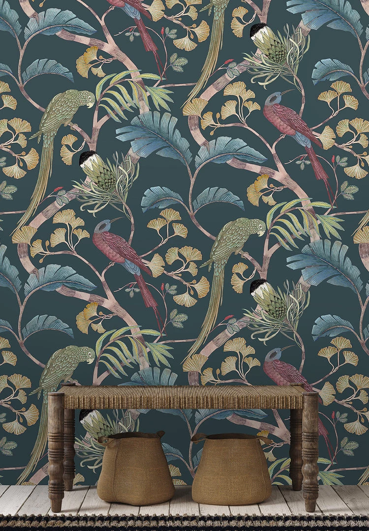 A hand painted tree full of exotic avifauna and flora. Parakeets and sunbirds nestle in the branches, surrounded by lush ginkgo leaves and protea blooms. Hand painted to create movement that will gently meander down your wall. Available in moody dark navy, and softer tones.