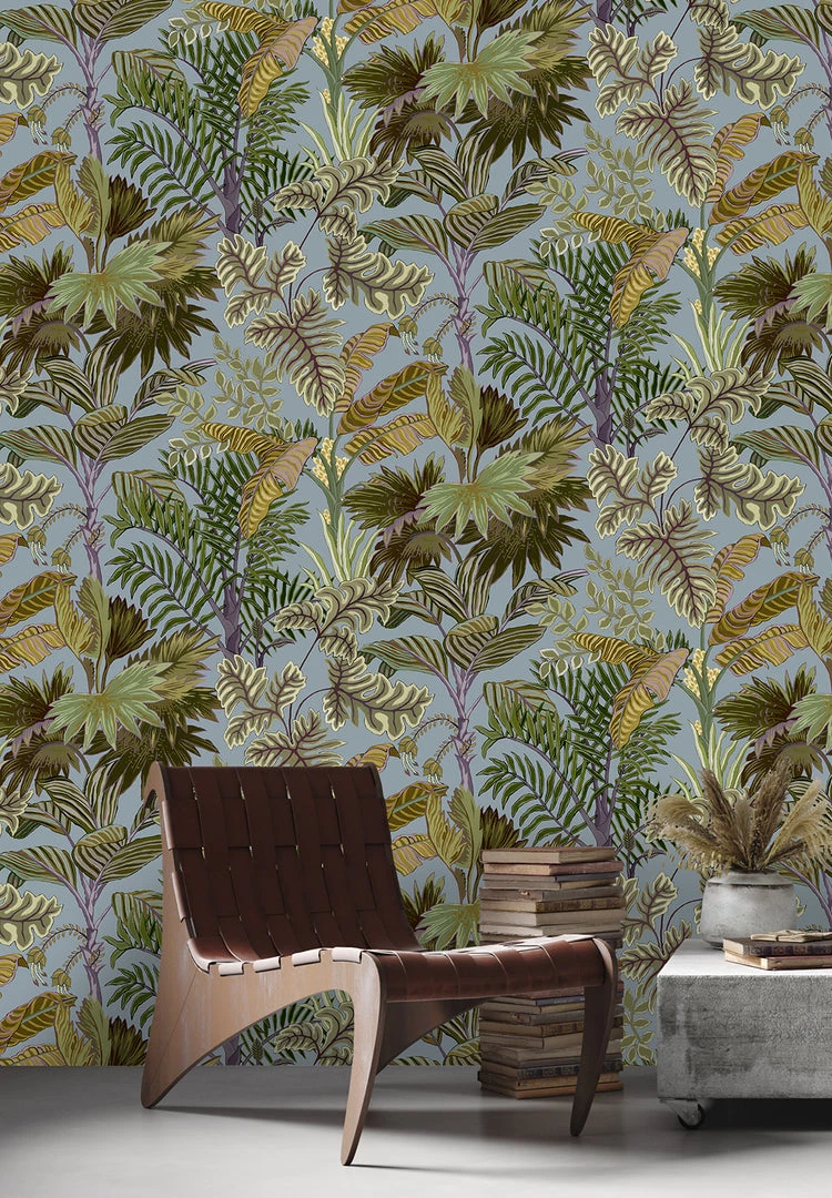A luscious density of palm trees creating a playful and naive design. This design was hand painted with watercolour paints.