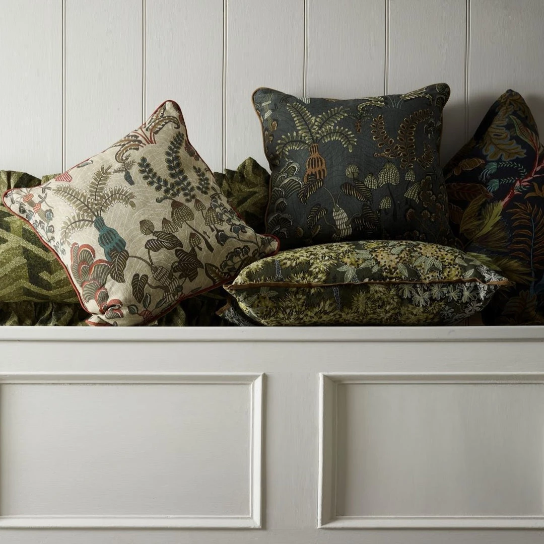 Inspired by a local woodland. Ferns unfold at your feet and mushrooms spill out of tree stumps creating a carpet of interest. Each element was captured, and hand painted. Piping detail and concealed zip.Â