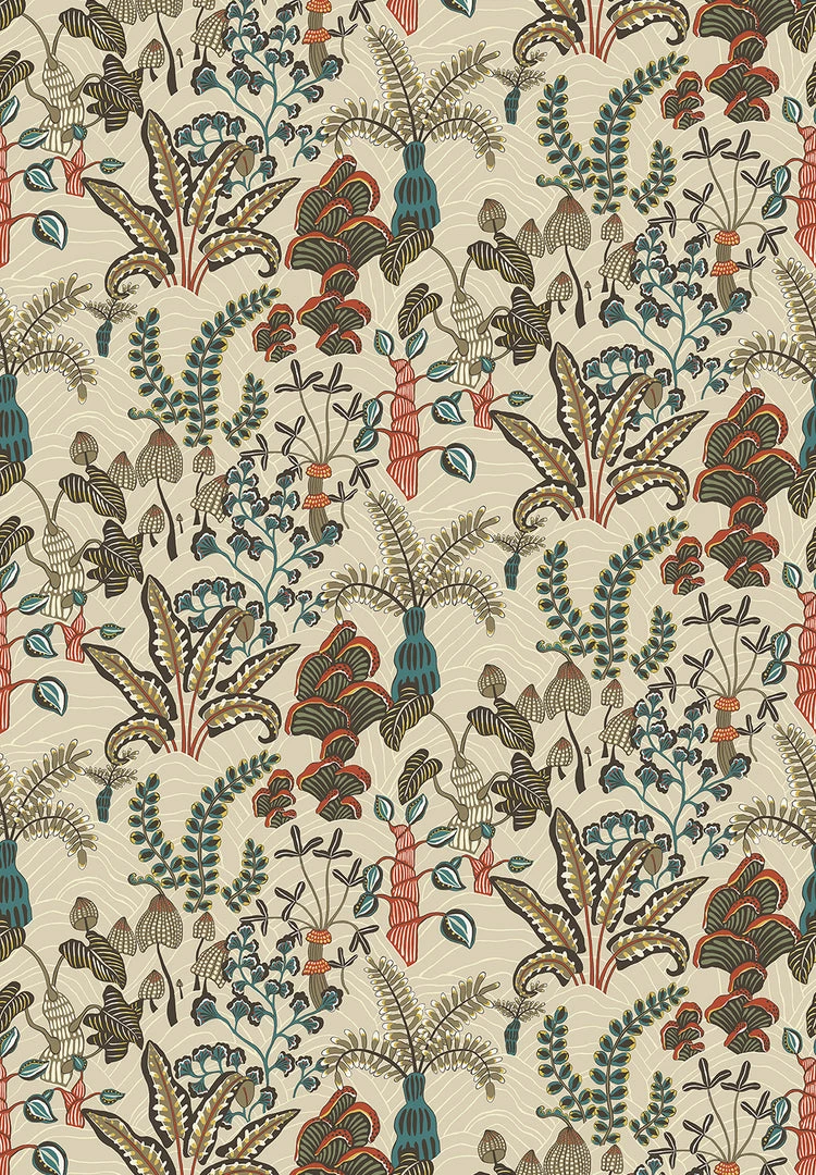 Inspired by a local woodland. Ferns unfold at your feet and mushrooms spill out of tree stumps creating a carpet of interest. Each element was captured, and hand painted.