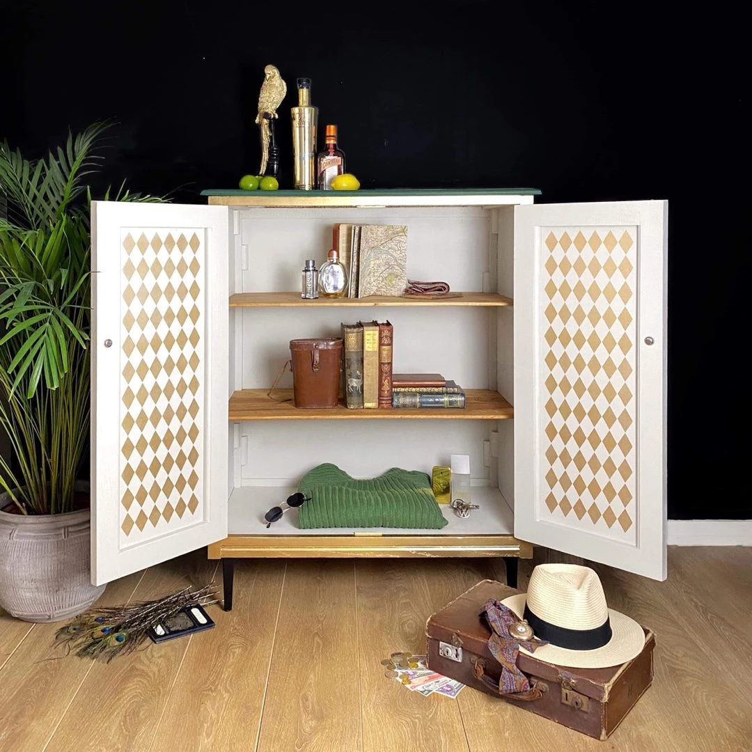 The interior is a calming neutral stone shade, with two original natural wood shelves. These have been sanded and refreshed with specialist furniture salve. Golden harlequin design, added to the inside of the door panels, perfectly complements the exterior patterning. The doors have new black metallic knobs from Anthropologie, and the cabinet sits majestically on low black legs to add a contemporary touch.