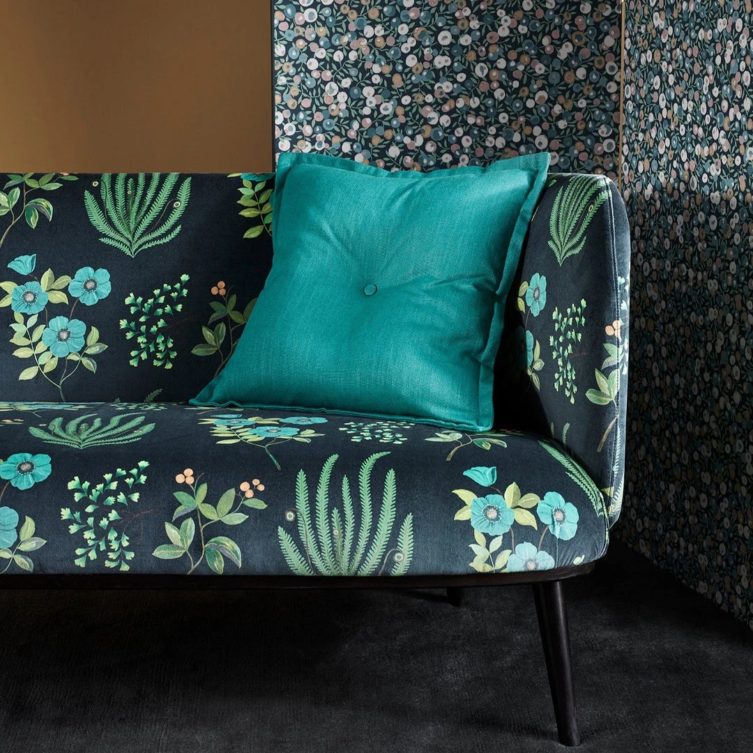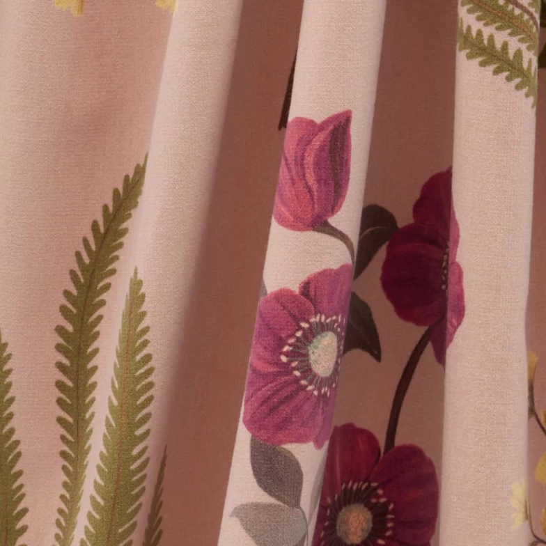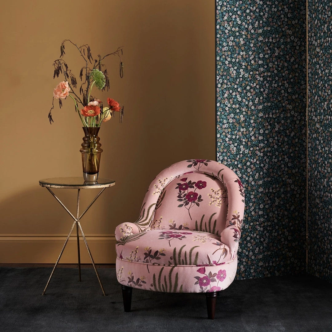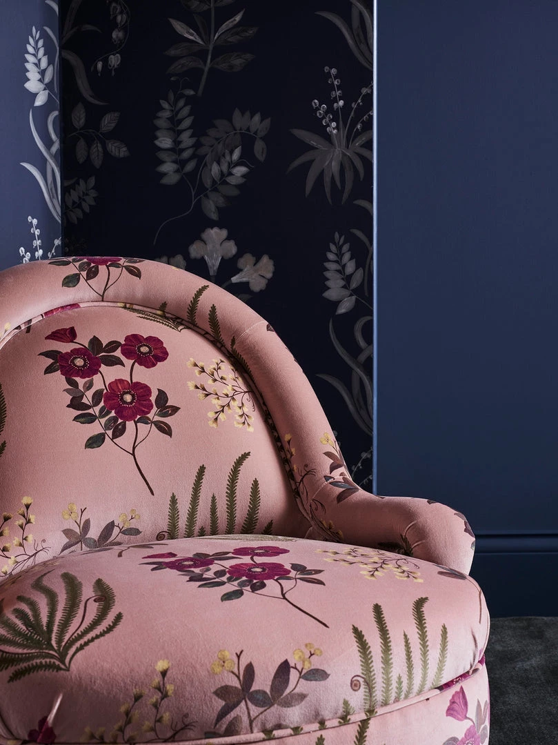 Hand-painted in the Liberty design studio, Botanical Flora is a hero artwork of the Floribunda story, celebrating the historic tradition of botanical illustration in Britain – featuring elegantly trailing flora such as dicentra spectabilis (bleeding heart) and lily-of-the-valley. Botanical Flora appears on cotton velvet, bringing to life the soft painterly nature of the motifs.