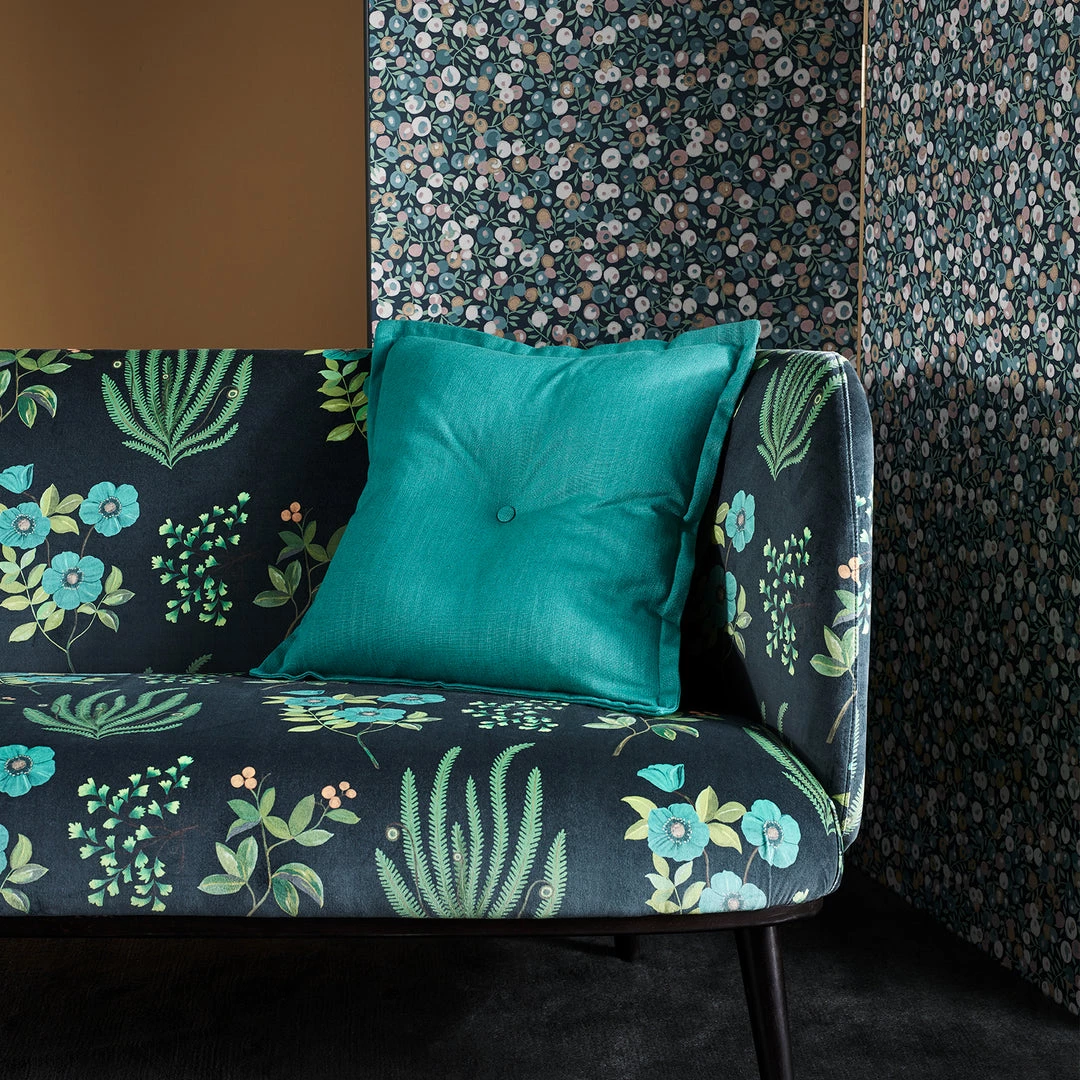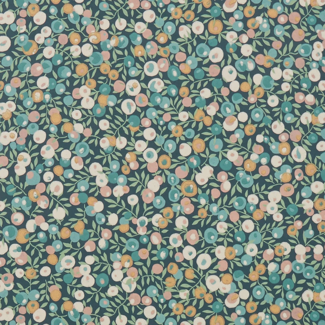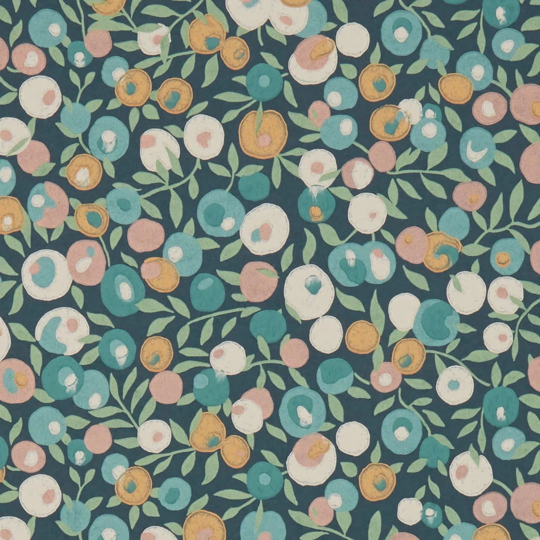 Wiltshire Blossom, the most iconic 1930s leaf-and-berry Liberty print is repainted and re-engineered into a contemporary furnishing design. It is printed using a hybrid technique which allows both flat colour and raised reticulated pigment to sit side by side, providing a beautiful tactility and clarity of print mark, rendered in both matte and metallic pigment.