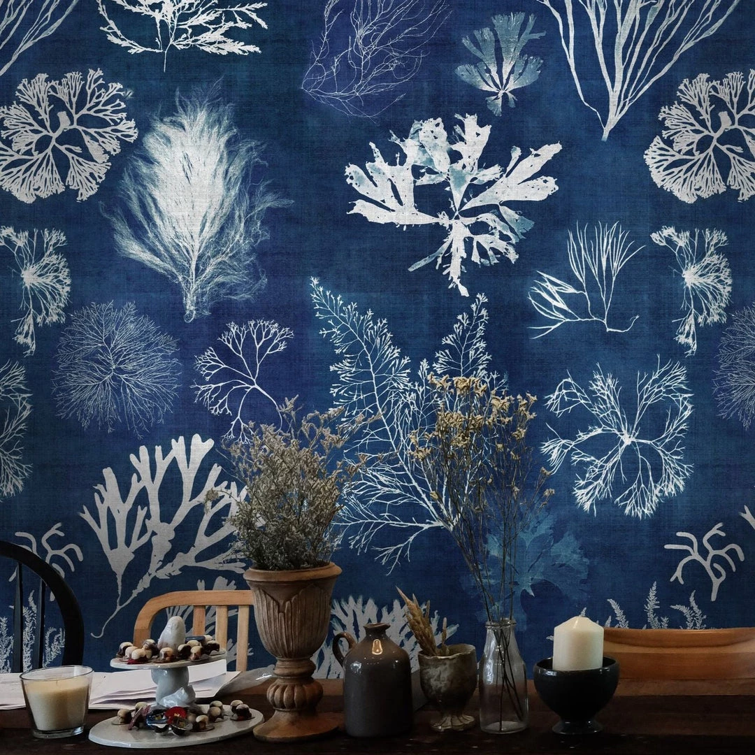 Make a statement with the Algae wallpaper from Mind The Gap. Featuring a monochrome ‘marine green’ design with delicate algae shapes. An impactful feature for any home. Easy to put up with the paste the wall application and will enhance any room whether it is one wall or all. This wallpaper is digitally printed using eco-friendly inks. Available in both Moss Green and Navy Blue.Â