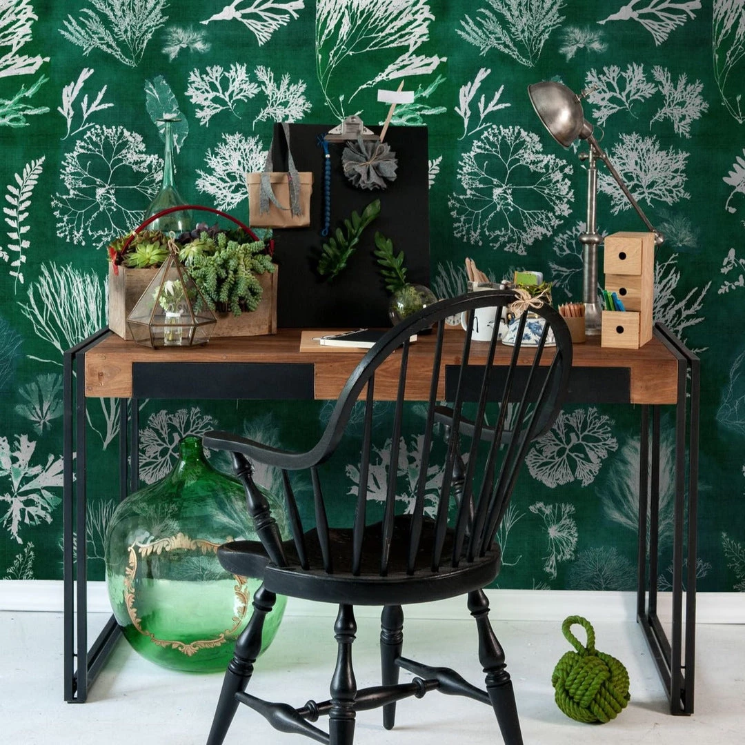 Make a statement with the Algae wallpaper from Mind The Gap. Featuring a monochrome deep sea navy blue design with delicate algae shapes. An impactful feature for any home. Easy to put up with the paste the wall application and will enhance any room whether it is one wall or all. This wallpaper is digitally printed using eco-friendly inks. Available in both Moss Green and Navy Blue.Â