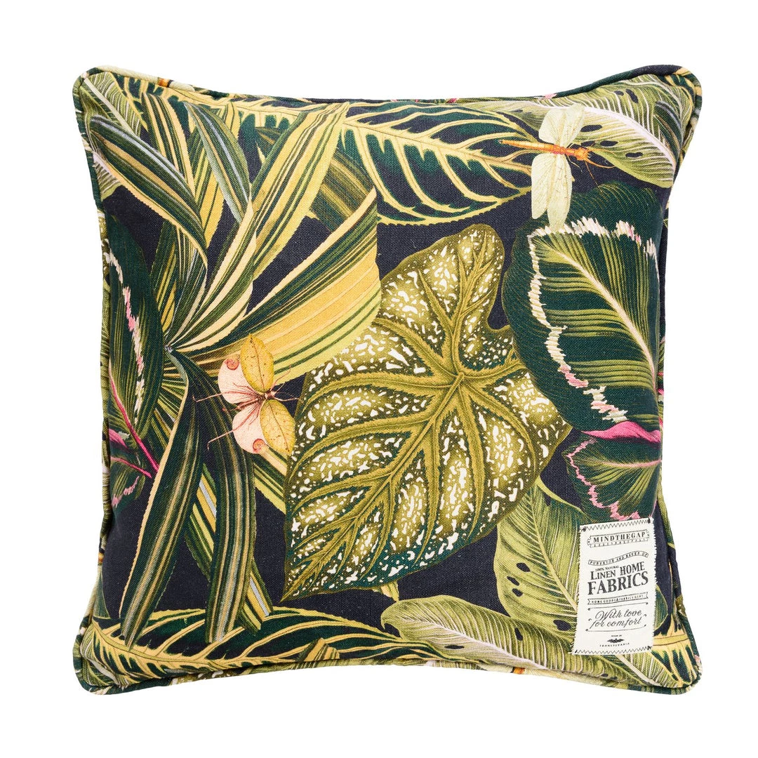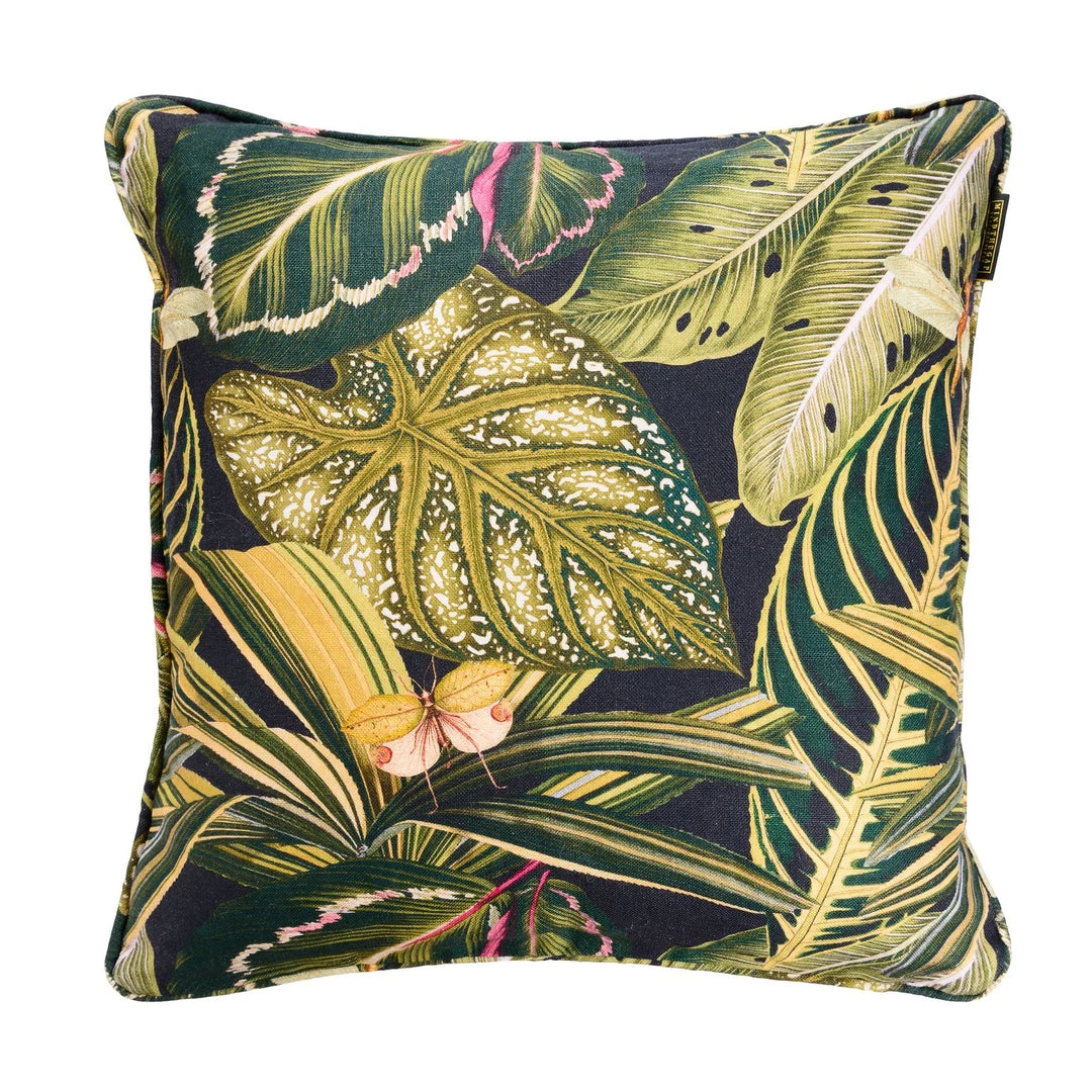 An exotic design of fauna and butterflies of the Amazon jungle. Dark greens on a black base with hot pops of pink and yellow. Stonewashed linen finished with assorted piping and 100% duck feather filling.  Also available in size 50 x 30. Our distinctive cushions show beautiful patterns and details of our fabrics. Made of heavy linen or cotton pile velvet all cushions are printed in England using traditional methods. Our cushions come with a variety of finishes such as fringes, tassels, pom-poms or printed borders adding little touches of luxury and uniqueness. Linens are stonewashed finished for softness and vintage effect.Â