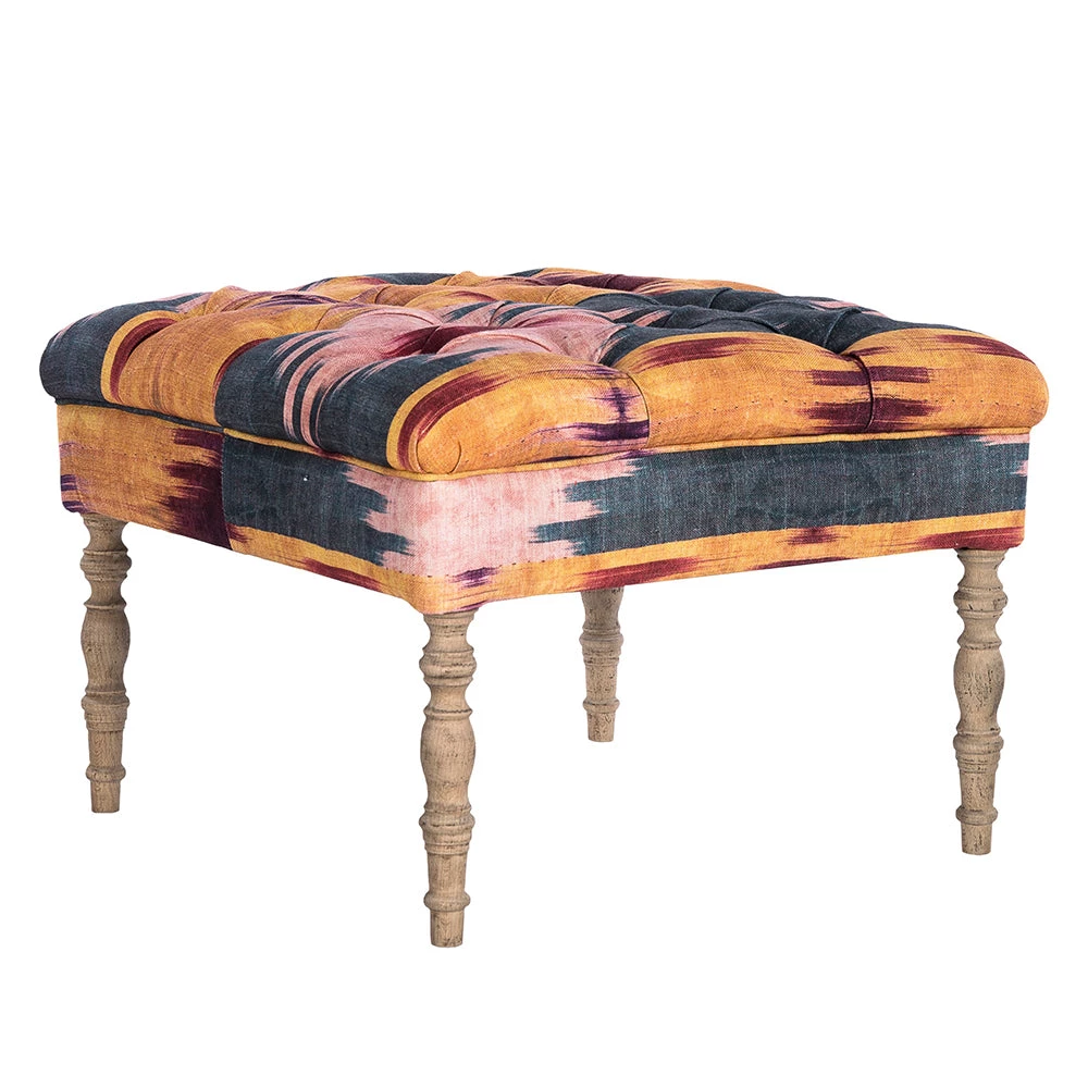 Mind the Gap’s collection of whimsical fabrics continues into this eclectic offering of furniture. PATOLA linen fabric of nomadic origin in blue, red & yellow adorns this classic styled ottoman with tufted seat and turned shape legs. Â