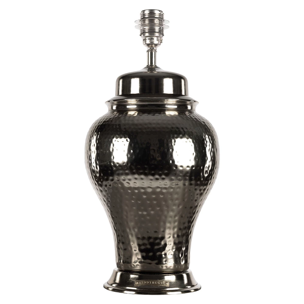 A beautiful and shapely table lamp base of hammered silver adding surface interest and texture. Metal hardware. Comes with E27 metallic lamp holder and black braided cable.