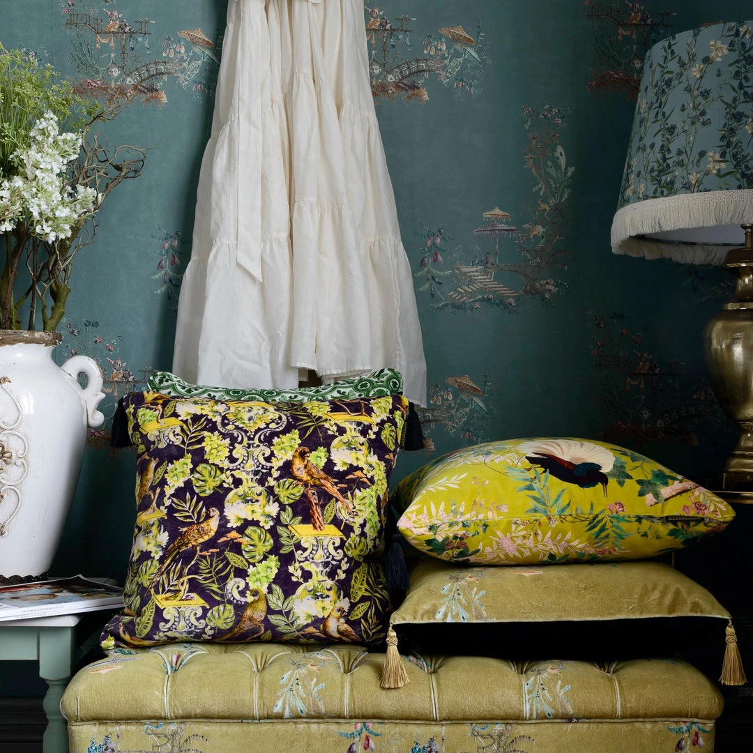 Adorn your walls with the gorgeous Chinoiserie Coconut wallpaper from Mind The Gap. Inspired by Jean Pillement’s hand-drawings in the 18th Century, this delicate and intricate wallpaper will be sure to make an impactful feature in any home. Easy to put up with the paste the wall application and will enhance any room whether it is one wall or all. This wallpaper is digitally printed using eco-friendly inks. Available in coconut and blue colourways. Also available on a mustard velvet fabric.Â
