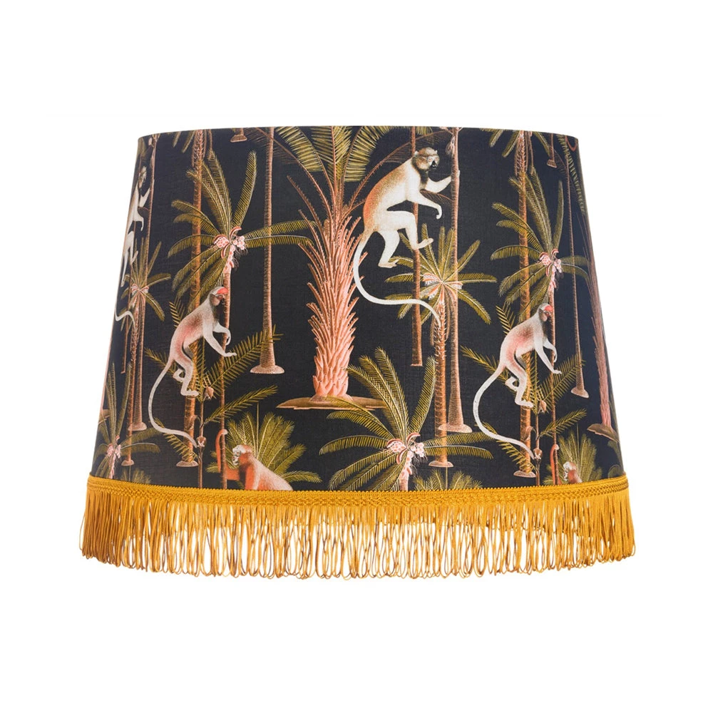 A tropical design featuring impressive palm trees and various monkeys on a black linen background. finished with gold lining and gold loop fringes.Â