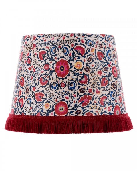 Shedding light in a bohemian, romantic feel, this lampshade traces soft details of local flowers. Poppies, Yarrows and wild irises are elegantly displayed in vibrant colours on a design finished with red fringes and golden metallic lining Part of the Transylvanian Roots collection. Folk Couture at it’s finest.