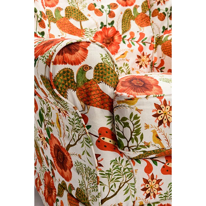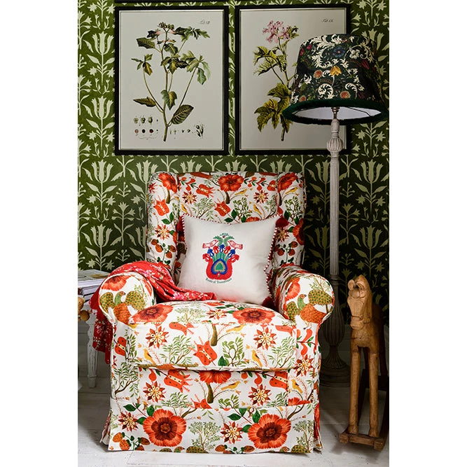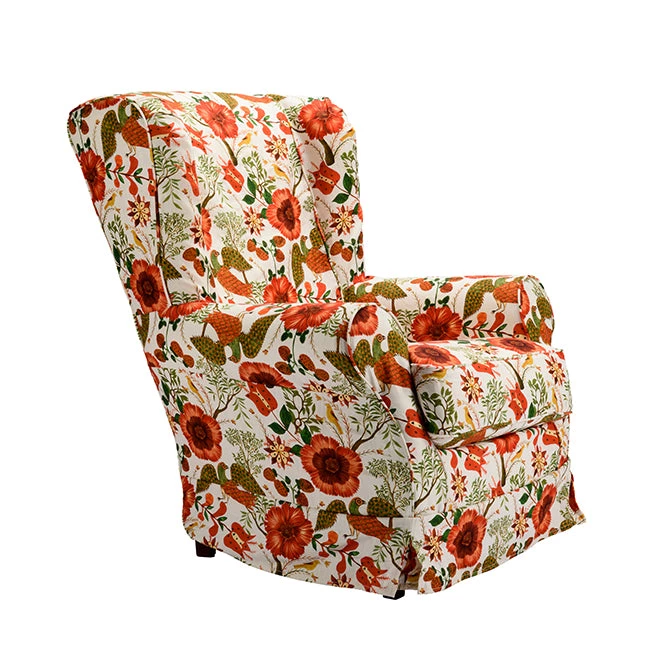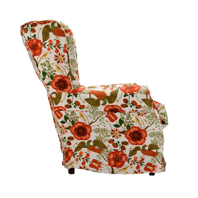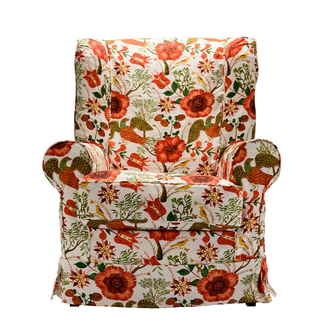 Mind the Gap’s collection of whimsical fabrics continues into this eclectic offering of furniture. Here the Neo-classic armchair silhouette is updated with Szekely Linen from the Transylvanian Roots collection.. A comfortable wing backed and rollover arms with cushioned seating. Sited on beechwood structure and tapered short legs. Upholstered with skirted cover.