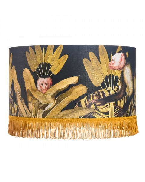 This rediscovered paradise print of Monkeys and golden palms highlighted against midnight sky. Gold metallic lining and gold looped fringes add to the richness.Â