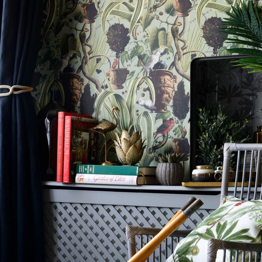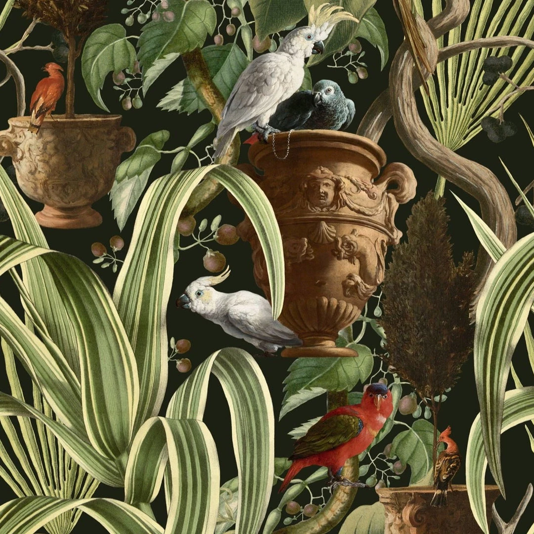 Make a statement with the Exotic Menagerie Dark wallpaper. Inspired by the gardens of nobility in the colonial period in the Caribbean, this rich and luscious wallpaper will bring the exotic tropics into your own home. Add depth and intrigue with this vibrant design, full of tropical foliage and intricately hand-painted birds. Easy to put up with the paste the wall application and will enhance any room whether it is one wall or all. This wallpaper is digitally printed using eco-friendly inks. Available in the colourways dark and light.Â