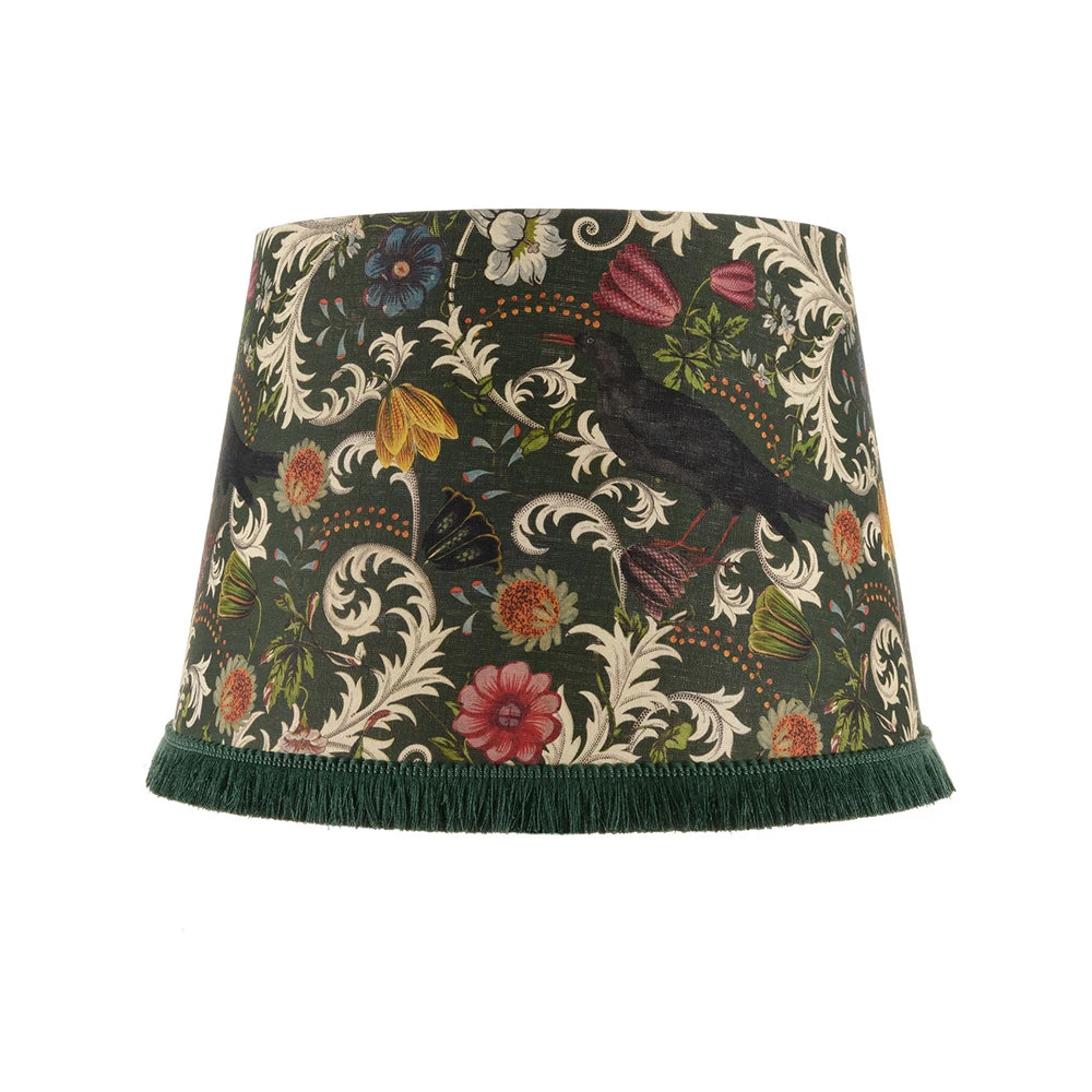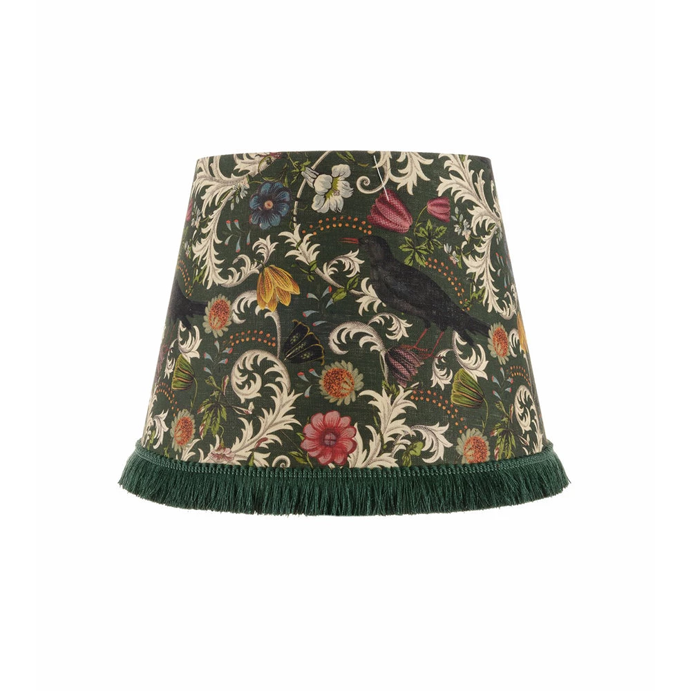 Rich Saxon vibes breeze through this printed linen cone shade, with the blackbird as a statement symbol on the top of an abundant flowery background. Finished with green fringes and golden metallic lining. Part of the Transylvanian Roots collection. Folk Couture at it’s finest.