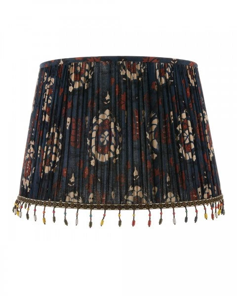 Earth tones, delicate flower shapes and signature hues of Transylvania-blue flourish together in a warm, comforting soft pleated lampshade. Finished with beaded fringes, the lampshade is fitted with reversible gimbal and white fabric lining. Part of the Transylvanian Roots collection. Folk Couture at it’s finest.Â