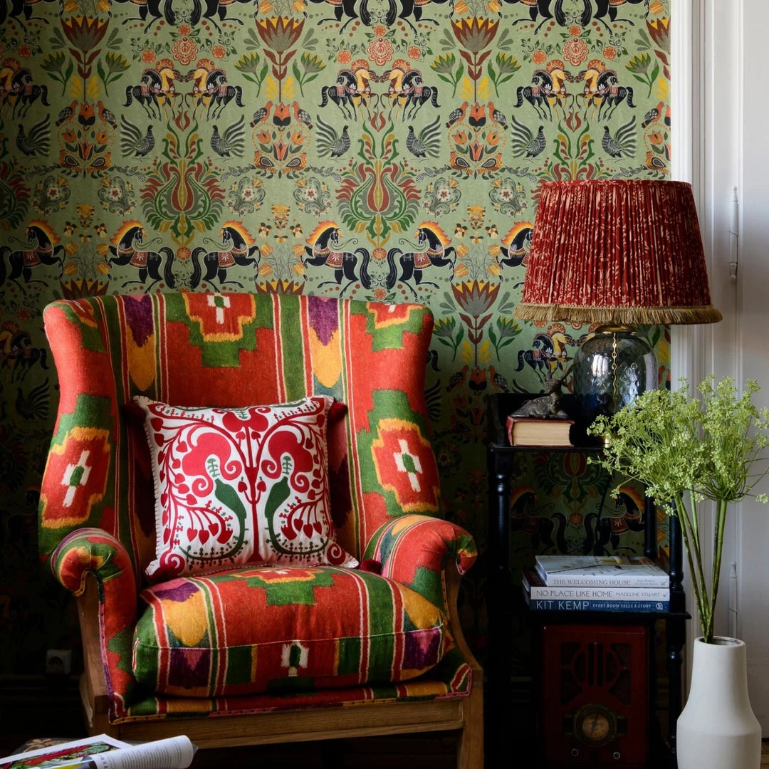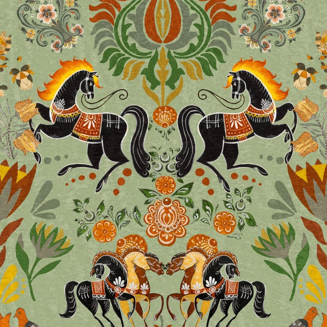 Inspired by the Traditional Saxon horse shows. Elegantly painted in rich colours, this pattern is full of beautiful symbols kept alive throughout history in local craftsmanship and artisanal goods. Folk Couture at it’s finest. Easy to put up with the paste the wall application and will add a bit of quirk to any room whether it is one wall or all. This wallpaper is digitally printed using eco-friendly inks.Â