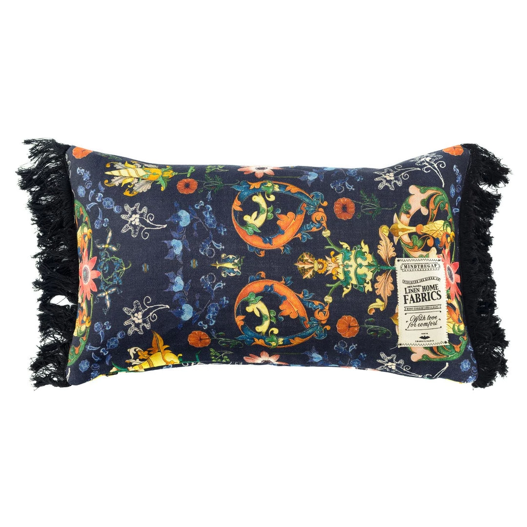 A rich tapestry like pattern on a deep blue background with spectacular floral motifs. Inspired by the Transylvanian Folk culture. Mysterious and opulent with fringe trimming on two sides. Stonewashed linen and 100% duck feather filling.