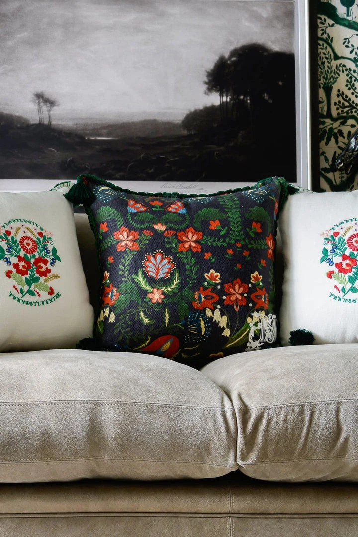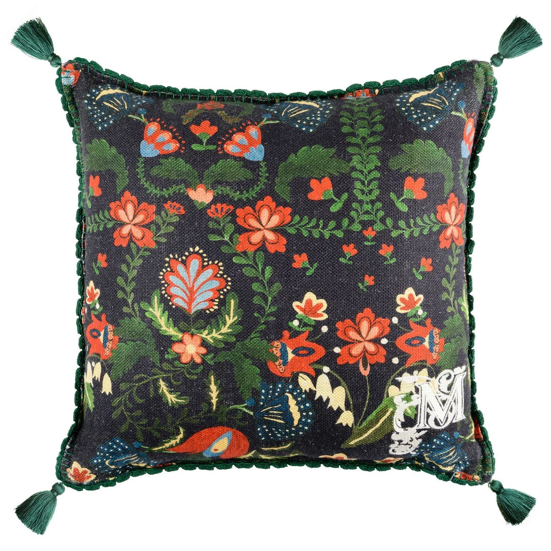 An intricate pattern featuring milfoil, bluebells and Carpathian wildflowers. Full pattern on both sides and with ‘M’ monogram on the back. Hand finished with green scalloped crochet trimming and cotton tassels.