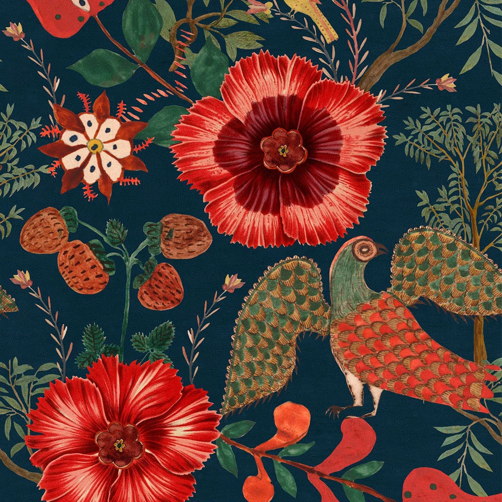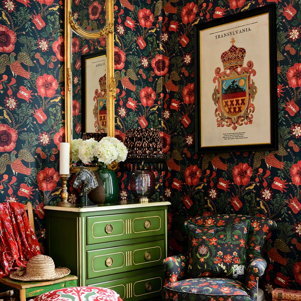 Bright blossoms highlight this Flowery Hungarian Folk pattern. Big flowers and folk birds stand out against a dark background creating a bold design. Folk Couture at it’s finest. Easy to put up with the paste the wall application and will add a bit of quirk to any room whether it is one wall or all. This wallpaper is digitally printed using eco-friendly inks.Â