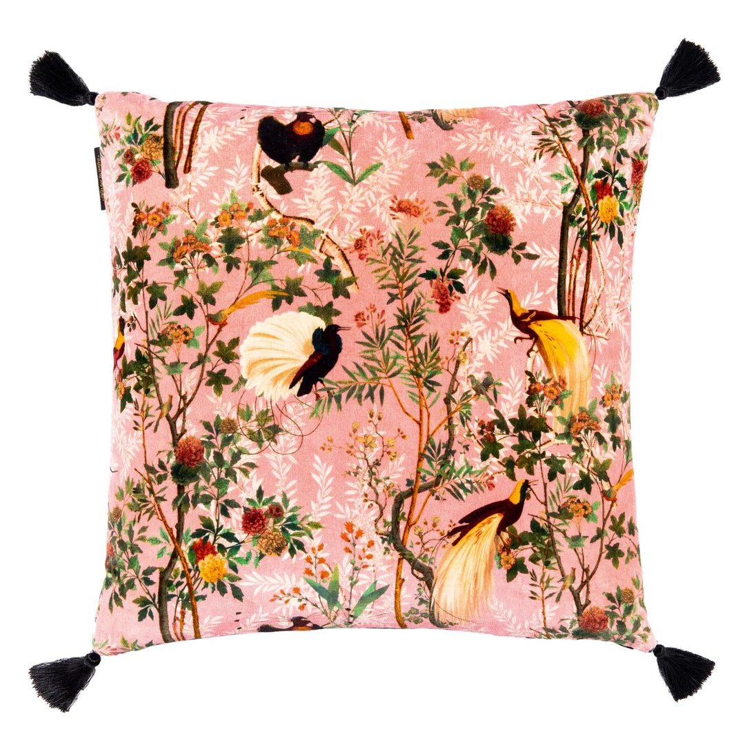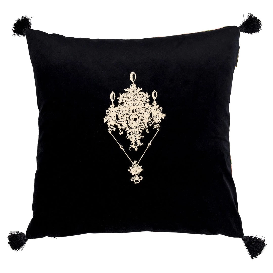 An antique style gem style embroidery adorns one side of this lush cushion, the other side is our Royal Garden cotton velvet in pink. Finished with four black tassels and 100% duck feather filling. Â Â