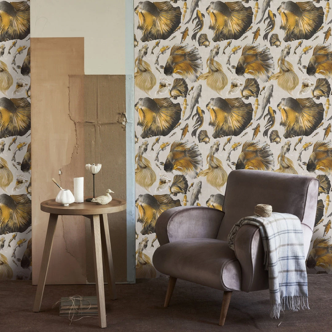 Swim with a shoal of fish and immerse yourself under the sea with the vibrant and beautifully illustrated Goldfish wallpaper from Mind The Gap. An impactful feature for any home. Easy to put up with the paste the wall application and will enhance any room whether it is one wall or all. This wallpaper is digitally printed using eco-friendly inks.Â