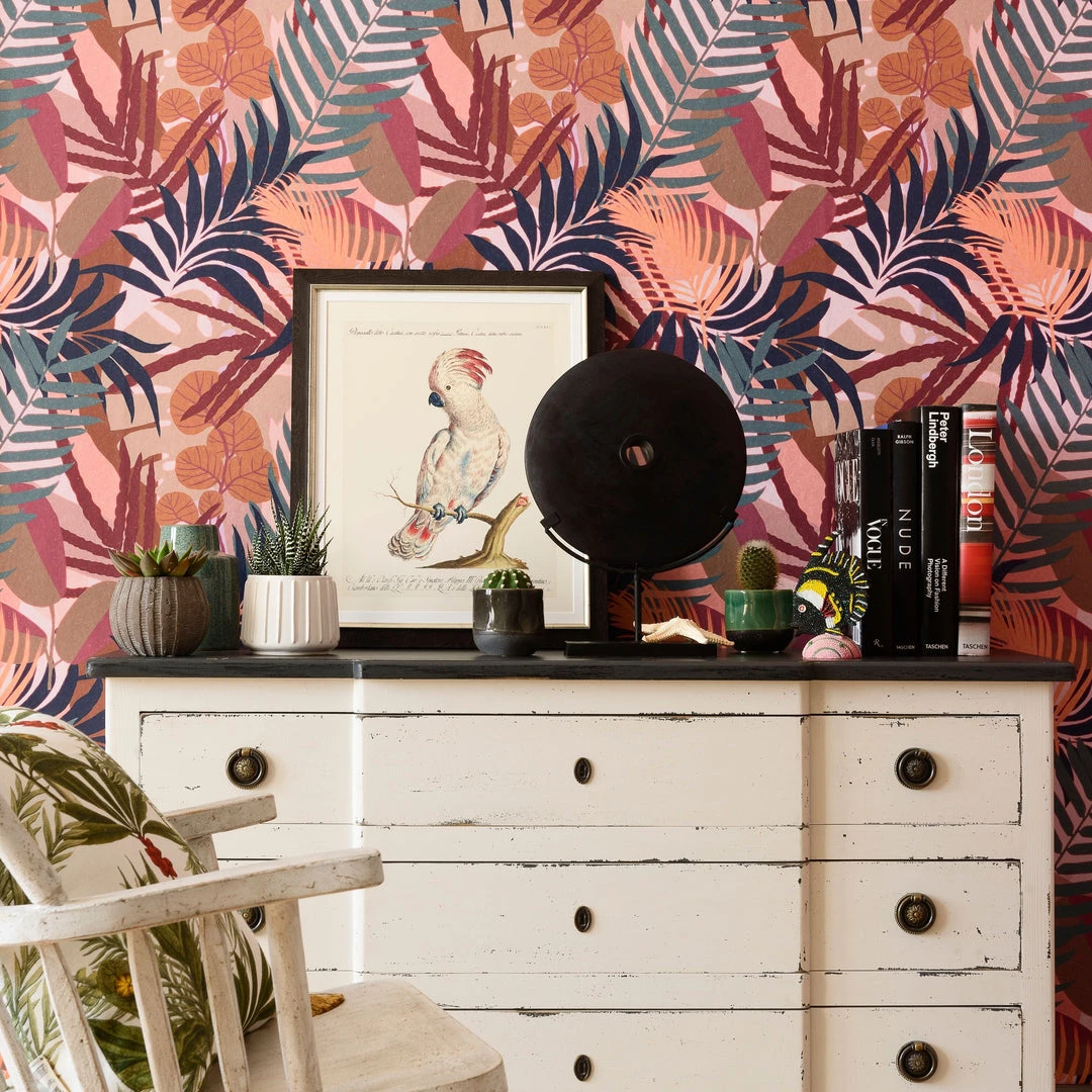 Decorate the walls with the Jardin Del Sol wallpaper from Mind The Gap. An abstract, vibrant wallpaper inspired by the gardens of Cuba. In this wallpaper, beautiful, tropical foliage sits upon a soft, pink background. The perfect wallpaper for adding intrigue and character into any room. Easy to put up with the paste the wall application and will enhance any room whether it is one wall or all. This wallpaper is digitally printed using eco-friendly inks. Available in both multi-coloured and monochrome green.