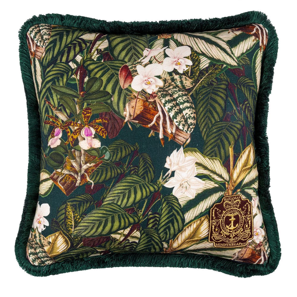 A rich tropical pattern or orchids and other vegetation full bloom . Rich tones with pops of pink Finished with the buccaneer’s patch, green fringe detailing and 100% duck feather filling.  Â
