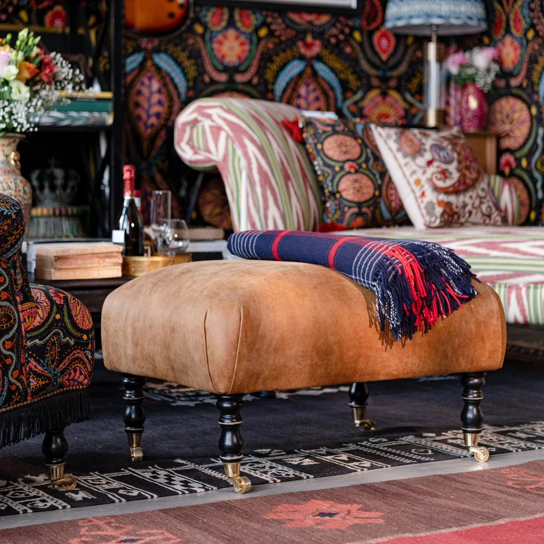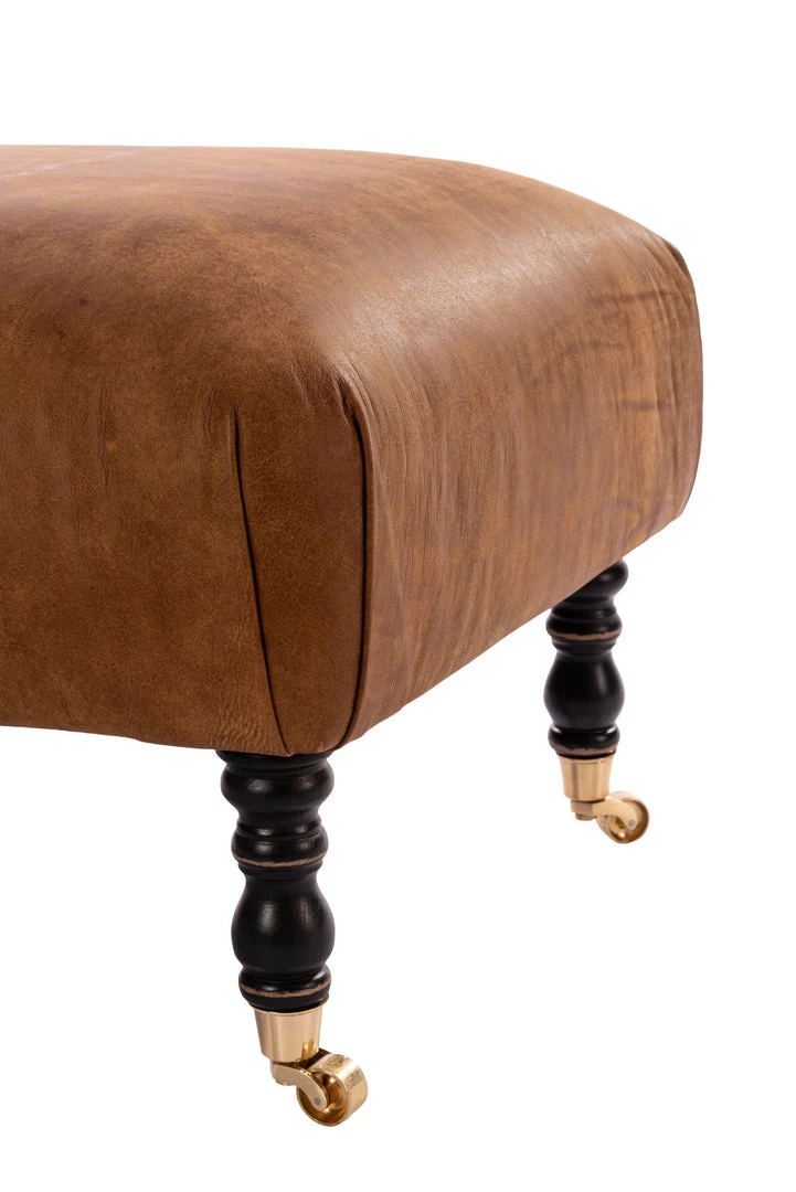 A piece-of-art ottoman with a cushioned seating, this HUDSON stool is dressed in brown leather. The beautiful turned black legs are finished with gold castors.