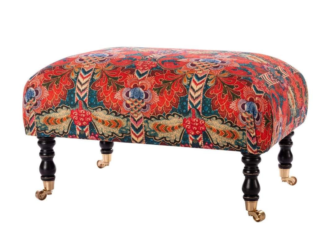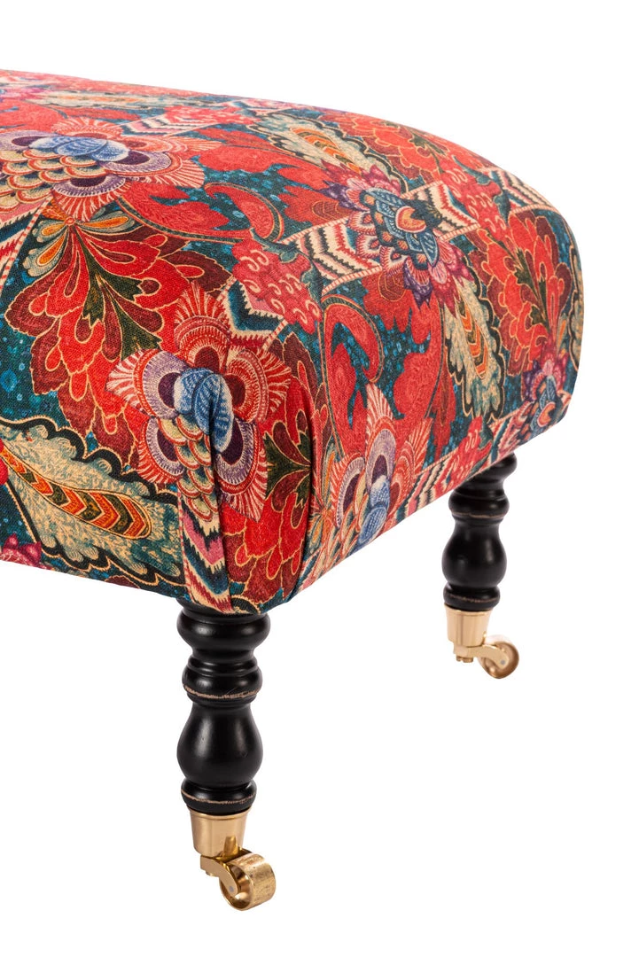 A piece-of-art ottoman with a cushioned seating, this HUDSON stool is dressed in PSYCHEDELIA linen fabric. The beautiful turned black legs are finished with gold castors.