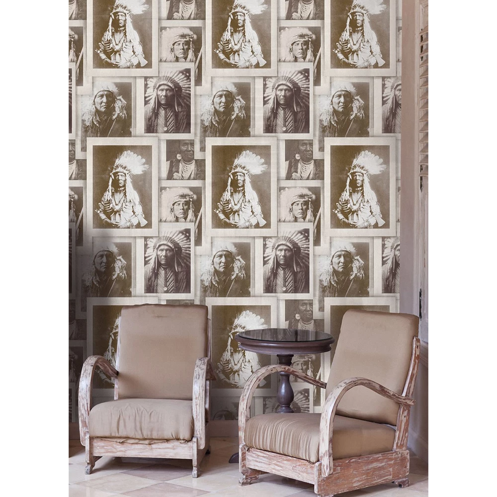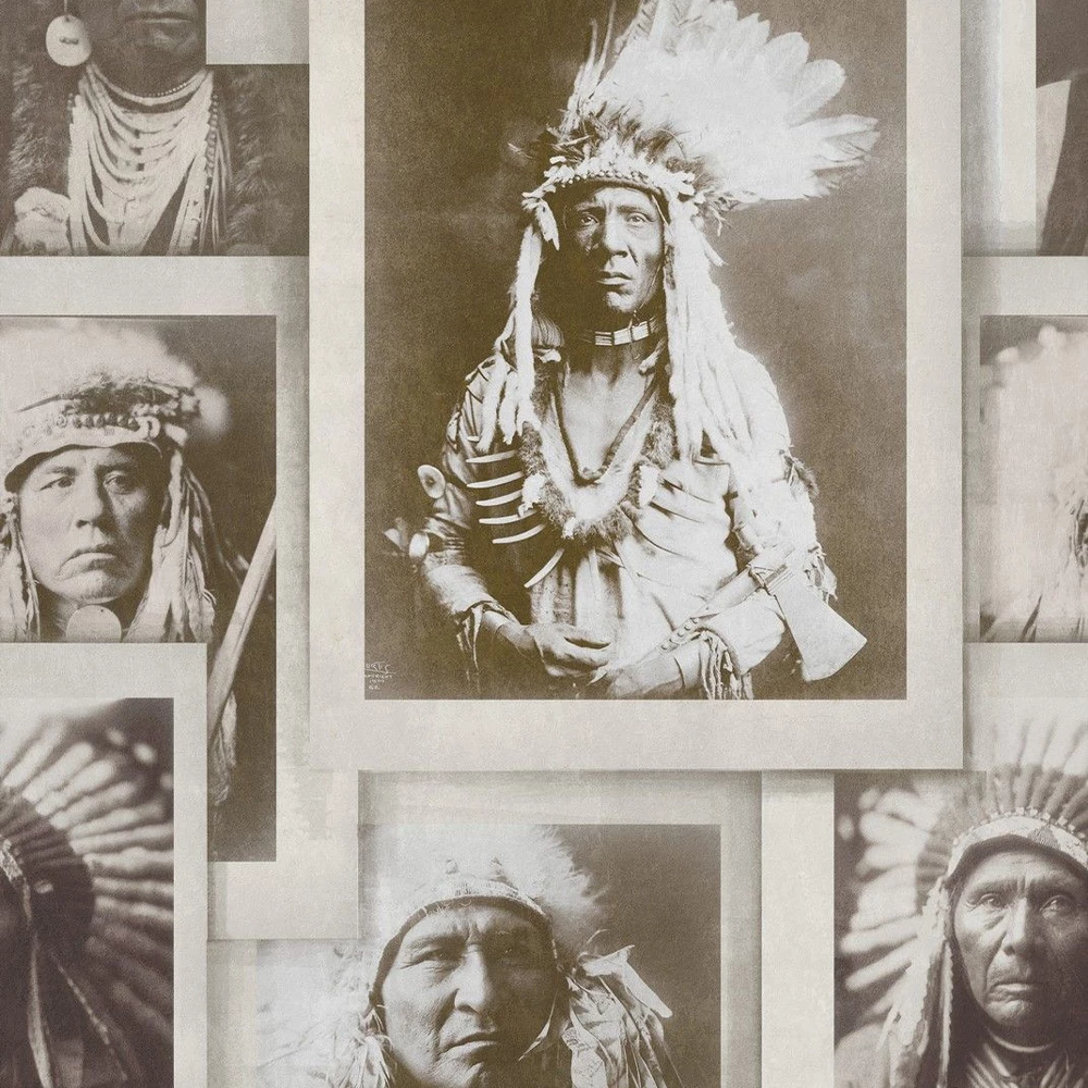 Immerse yourself in the Indian Chiefs Sepia Wallpaper from Mind the Gap, featuring photographs of Native American Chiefs, taken by Edward Curtis. Use to enhance any room whether a maximalist statement or feature area.Â