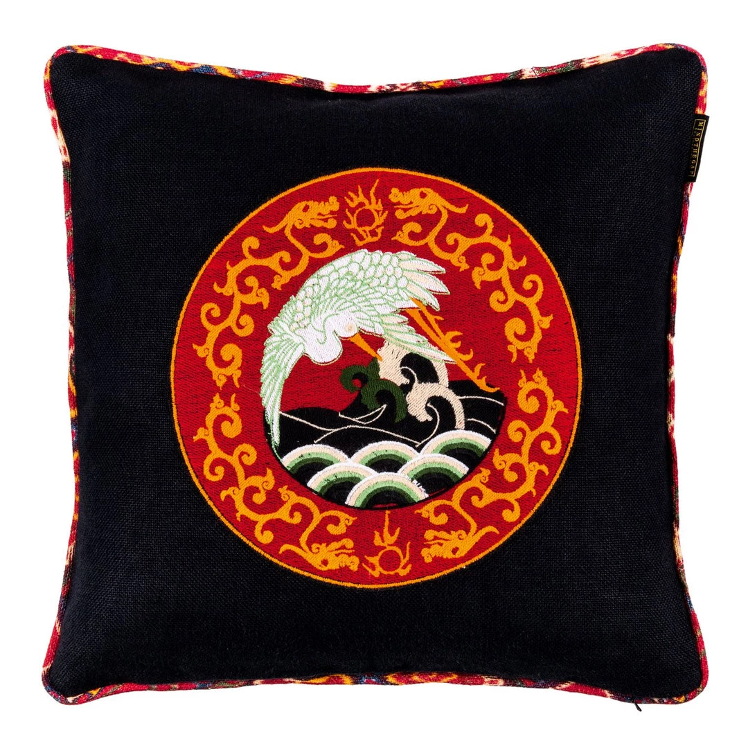 DOUBLE SIDED EMBROIDERED CUSHIONS – ASIAN CRANE / UZBEK IKAT 50 x 50 cm