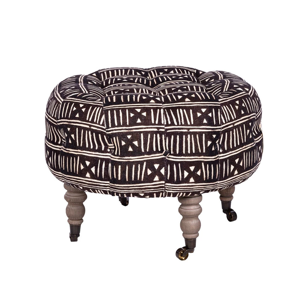Mind the Gap’s collection of whimsical fabrics continues into this eclectic offering of furniture. BOGOLANFINI linen adorns this tufted stool as a perfect pair to the LOUIS chair. Buttoned tufted seat and elegant turned legs. Graphic and bold in black and white print – vintage wooden legs with castors. Â