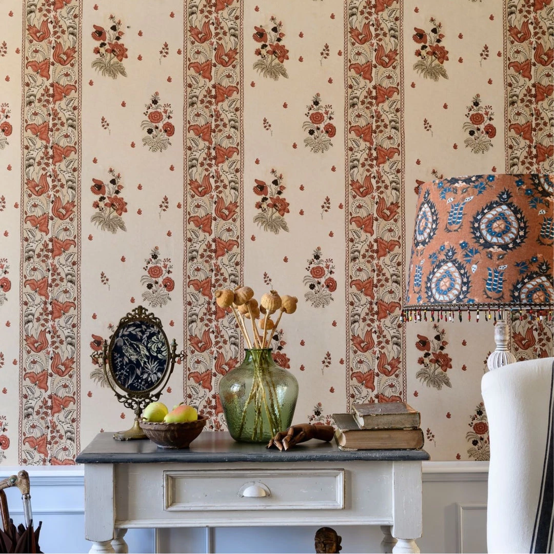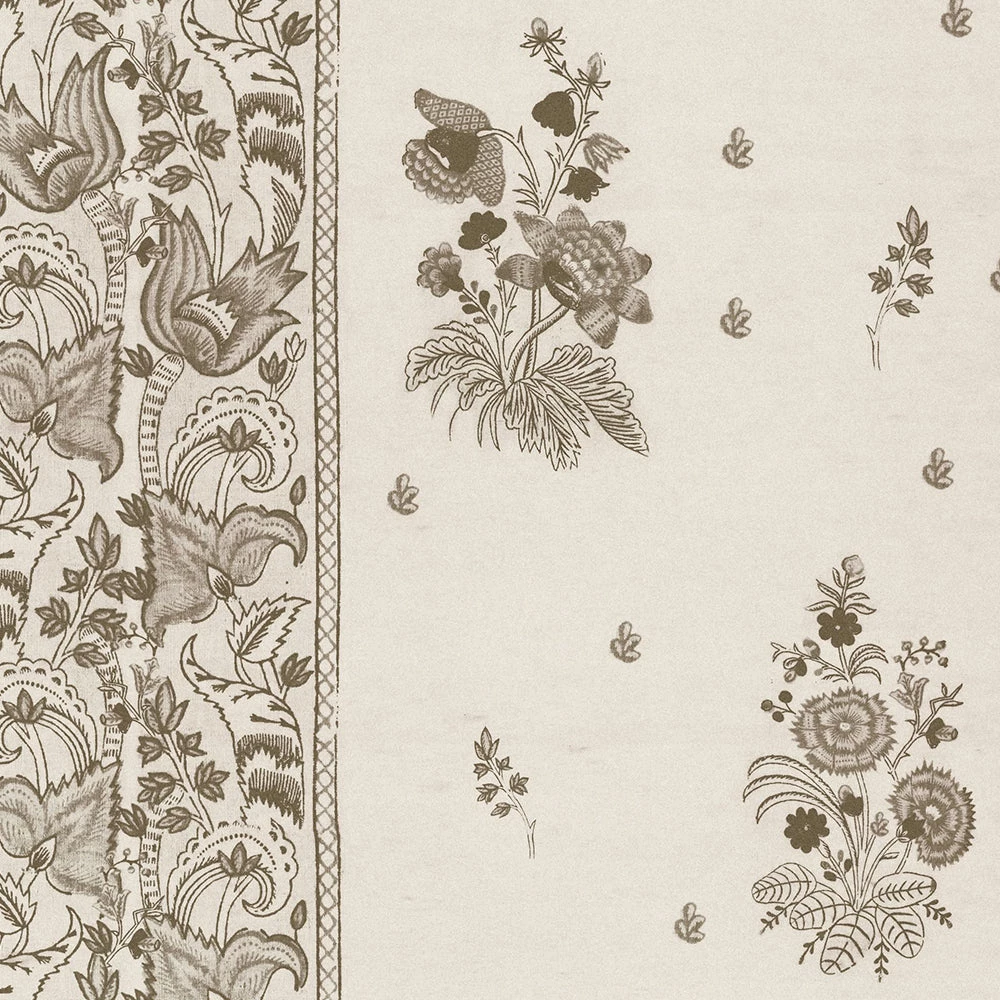 Inspired by the old Transylvanian pottery, this pattern plays homage to the customs of our artisan ancestors. A plethora of flowers in rich earth tones, a repeating panel and vertical border enrich this hand drawn pattern. Multi print on satin matt non-woven paper. Folk Couture at it’s finest. Available in Beechnut, Clematis, Dune, Indigo and Leather.