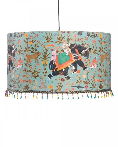 A fun and whimsical print, a sacred Elephants, lions and blooms dance against the beautiful aquamarine backdrop. Colourful pops of brightness light up the sky with a metallic gold lining. Finished with braided lace ribbon and multicoloured beads.
