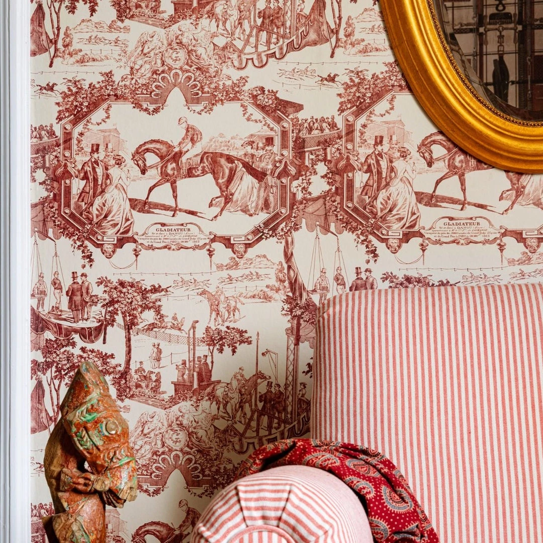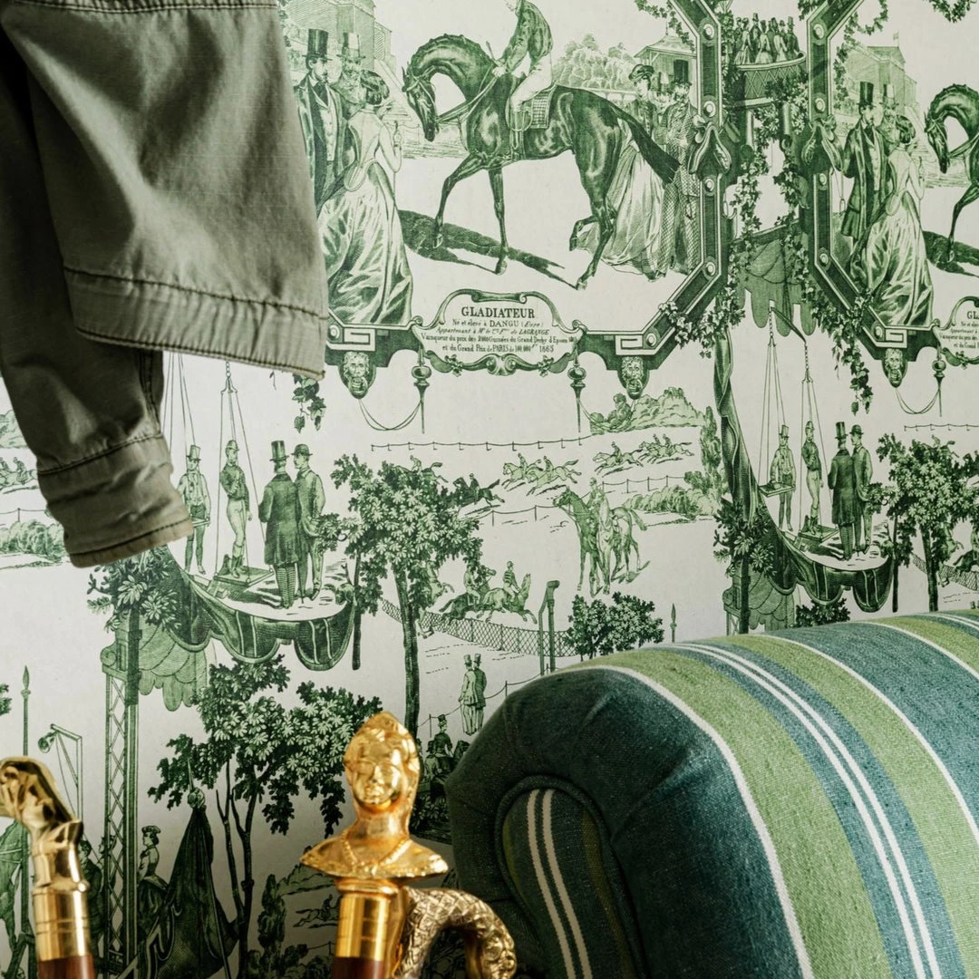 Surround yourself with the beautiful Grand Prix wallpaper from Mind The Gap. Influenced by the French Toile de Jouy patterns, this design depicts a day at the race course. Find delicate and intricate details, all hand illustrated to achieve a special and impactful statement for any interior, both traditional and contemporary. Available in both green and smokey red. Easy to put up with the paste the wall application and will add a bit of quirk to any room whether it is one wall or all. This wallpaper is digitally printed using eco-friendly inks.Â