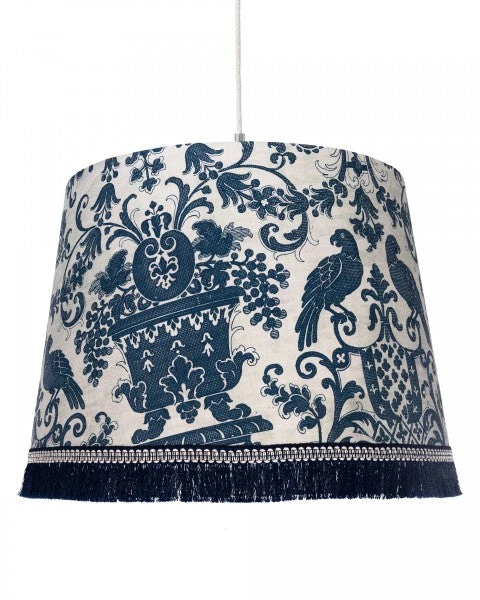 A Baroque inspired design showing a beautiful engraving in the classic white and dark blue. A pair of delicate birds finished with white fabric lining and blue fringe.