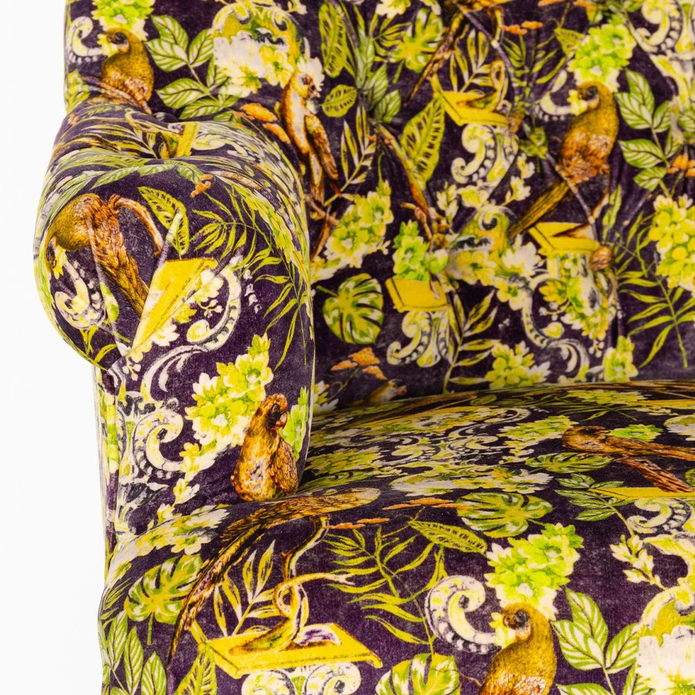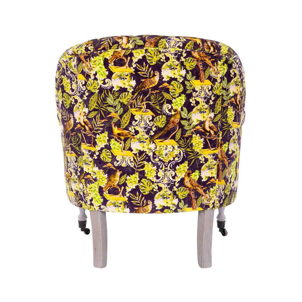 Mind the Gap’s collection of whimsical fabrics continues into this eclectic offering of furniture. La Voliere 100% cotton velvet from our ROYAL GARDEN fabric adorns this French styled low seating armchair , with overstuffed & tufted backrest and arms for real comfort. Finished with turned legs in vintage brushed wood with black metallic coastersÂ