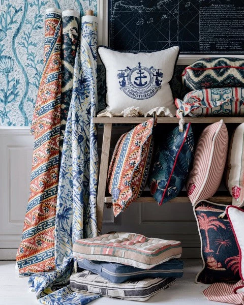 With a true Mediterranean-inspired design, the AEGEAN Indigo displays wonderful island-life details, all oozing calm holiday vibes. Having a fine texture given by the linen fibres against an indigo background, palm trees are traced in shades of coral red, highlighting the vibes of a summer night. Ideally to be used for light upholstery or soft furnishings, curtains or blinds. The pattern is also available against a light taupe background, on a cotton fabric.Â