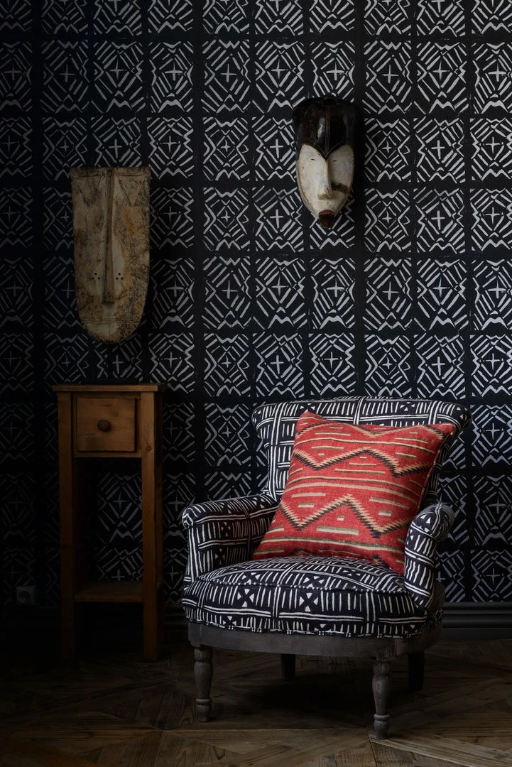 This contrast print inspired by ancient Malian patterns which were traditionally dyed with fermented mud and often mimicked animal prints. Bold patterns have been adopted into the modern Farmhouse look adding depth and weaving into our cultural psyche. Also working well with mid-century styles.